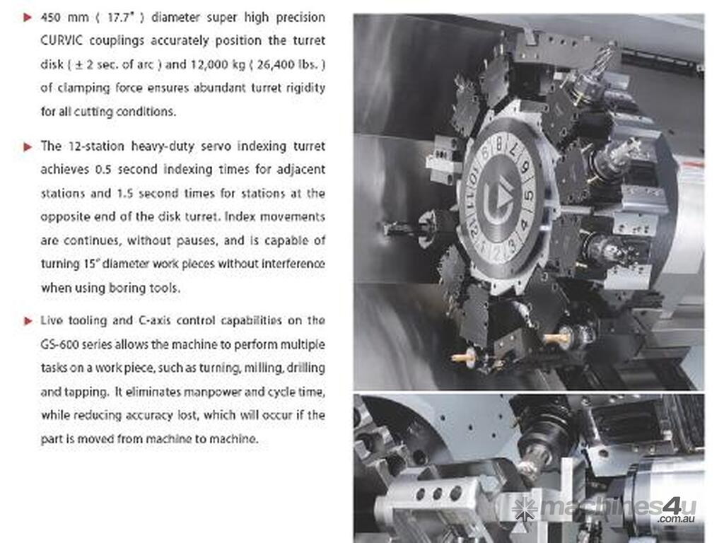 With leading technologies and high quality components, the GS-6000 series maximum performance turning centre combines a super rigidity box way bed with super large diameter servo indexing turret and 2-step gear spindle structure that provides great horse power, high speed indexing, and heavy-duty cutting capabilities. The GS-6000 series is available with optional L² model, with up to 3,300 mm turning length and "M" model, with live tooling turret and C-axis, which enables higher cutting flexibility and multi-tasking power to meet most of today and tomorrow’s turning applications demands.