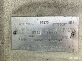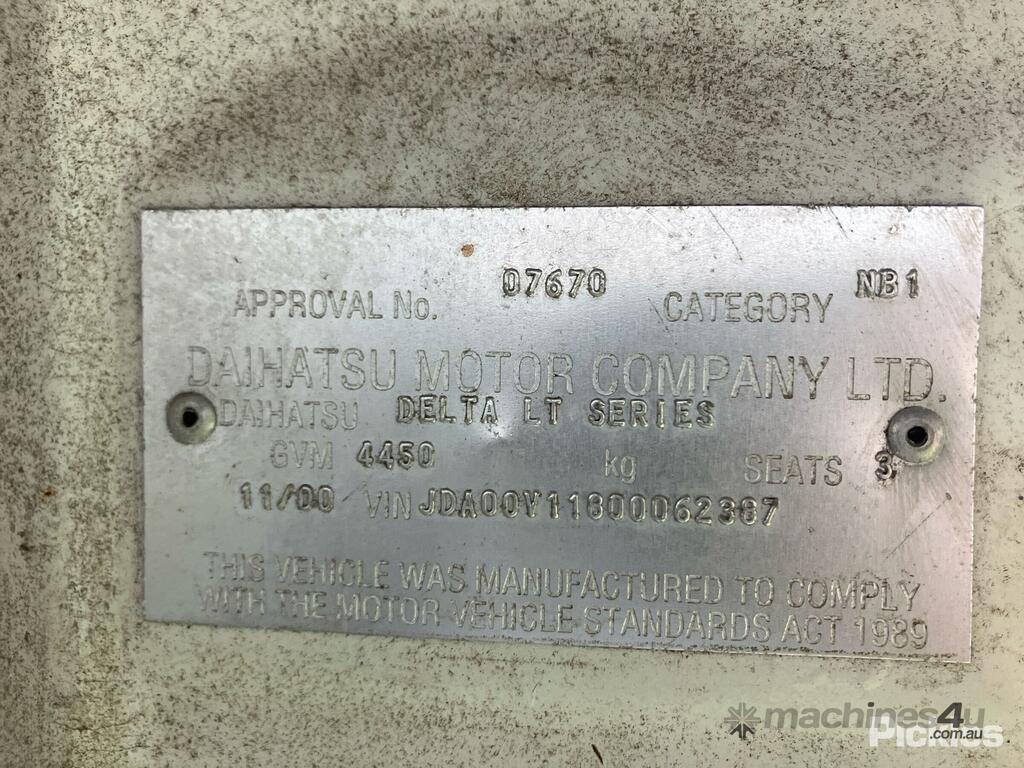 CP: 11/2000,Daihatsu,Delta LT,Day Tipper,Manual,Leaf Springs,4 Cyl,Diesel,267584 (Kms. Showing on Odometer),Hourmeter not visible,Colour: White,Rego. No: NP(BF79RA), Unregistered NSW,VIN: JDA00V7,GVM: 4450,Sold with No Plates,WOVR Status: Inspection Passed Repairable Writeoff