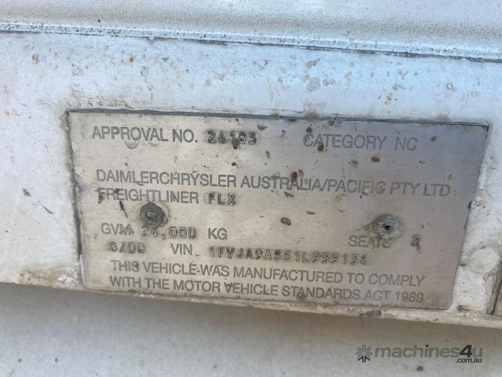 CP: 08/2000,Freightliner,Century Class FLX C112,Prime Mover,Manual,Airbag,CAT,6 Cyl,Diesel Turbo,18 Gears,1409347 (Kms. Showing on Odometer),Hourmeter not visible,Colour: White,Rego. No: NP(SB24AU), Unregistered,VIN: 1FVJA9AS61L959154,GVM: 24000,GCM: 70000,Sold with No Plates,WOVR Status: WOVR N/A,Incident Type: Not Applicable