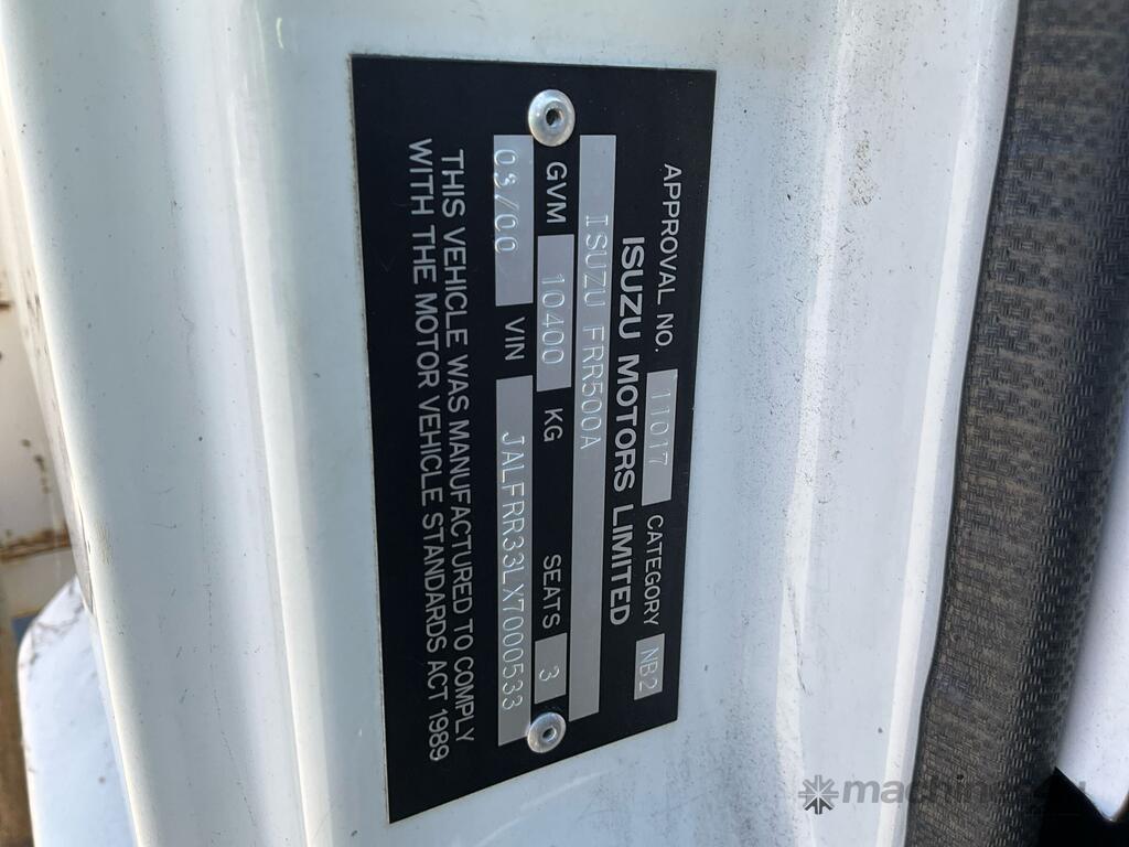 CP: 03/2000,Isuzu,FRR500 LWB,Table Top,Manual,Leaf Spring Suspension,6 Cyl,Diesel,249611 (Kms. Showing on Odometer),Hourmeter not visible,Colour: White,Rego. No: NP(QFO200), Unregistered VIC,VIN: JALFRR33LX7000533,Key No: 345,GVM: 10400,GCM: 14890,Sold with No Plates,Key No: 345