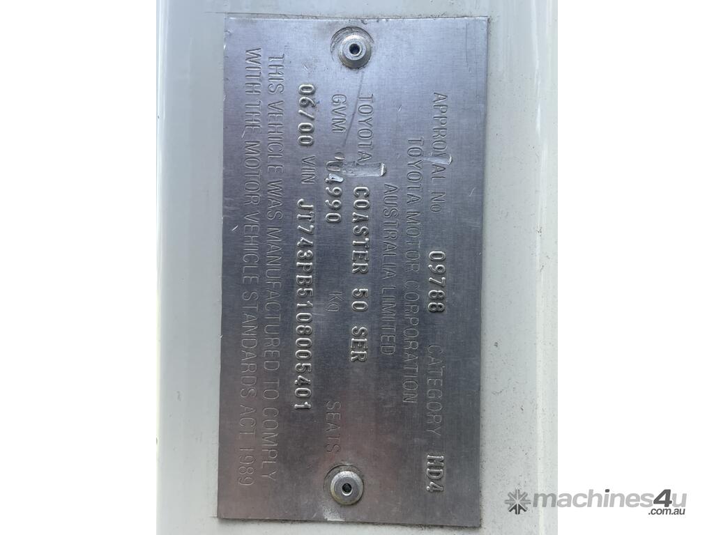 CP: 06/2000,Built: 05/2000,Toyota,Coaster,Bus,Manual,5 Gears,497122 (Kms. Showing on Odometer),Hourmeter not visible,Colour: White,Rego. No: NP(WKP629), Unregistered SA,VIN: JT743PB,Sold with No Plates