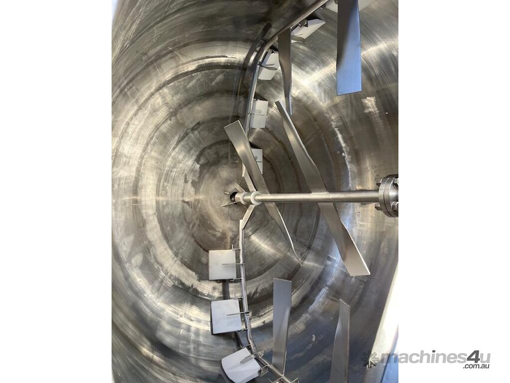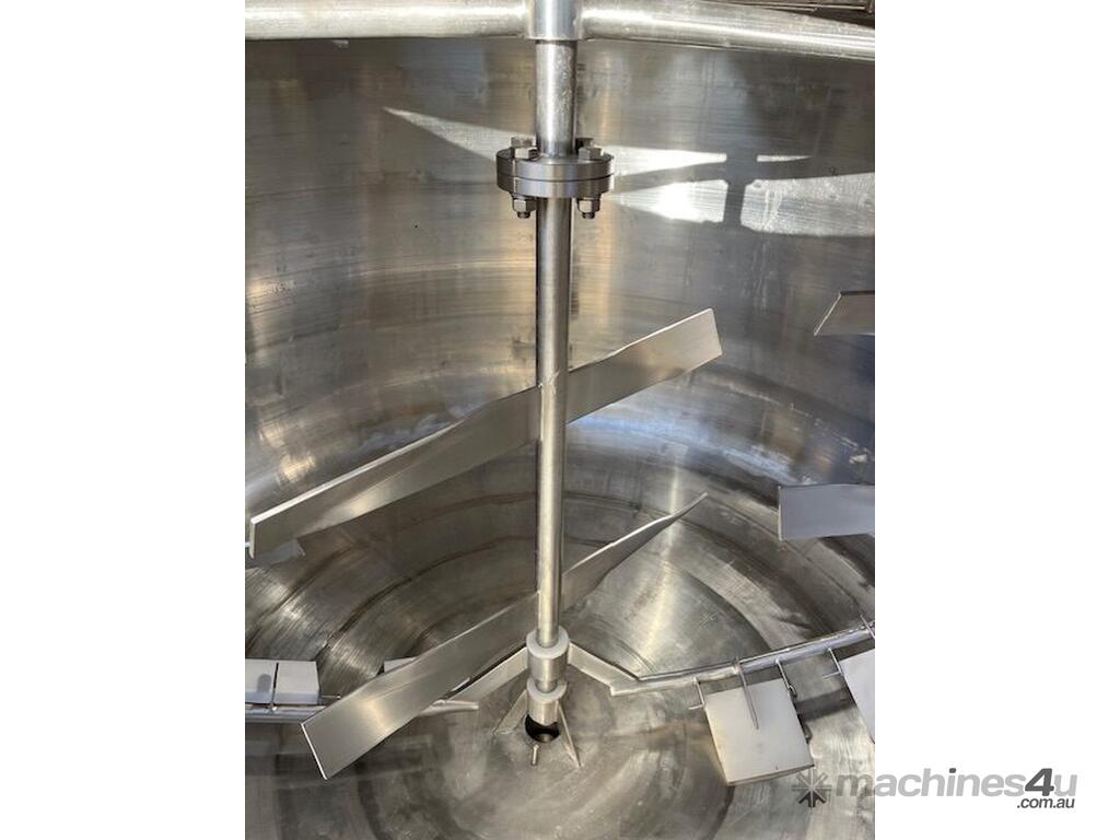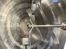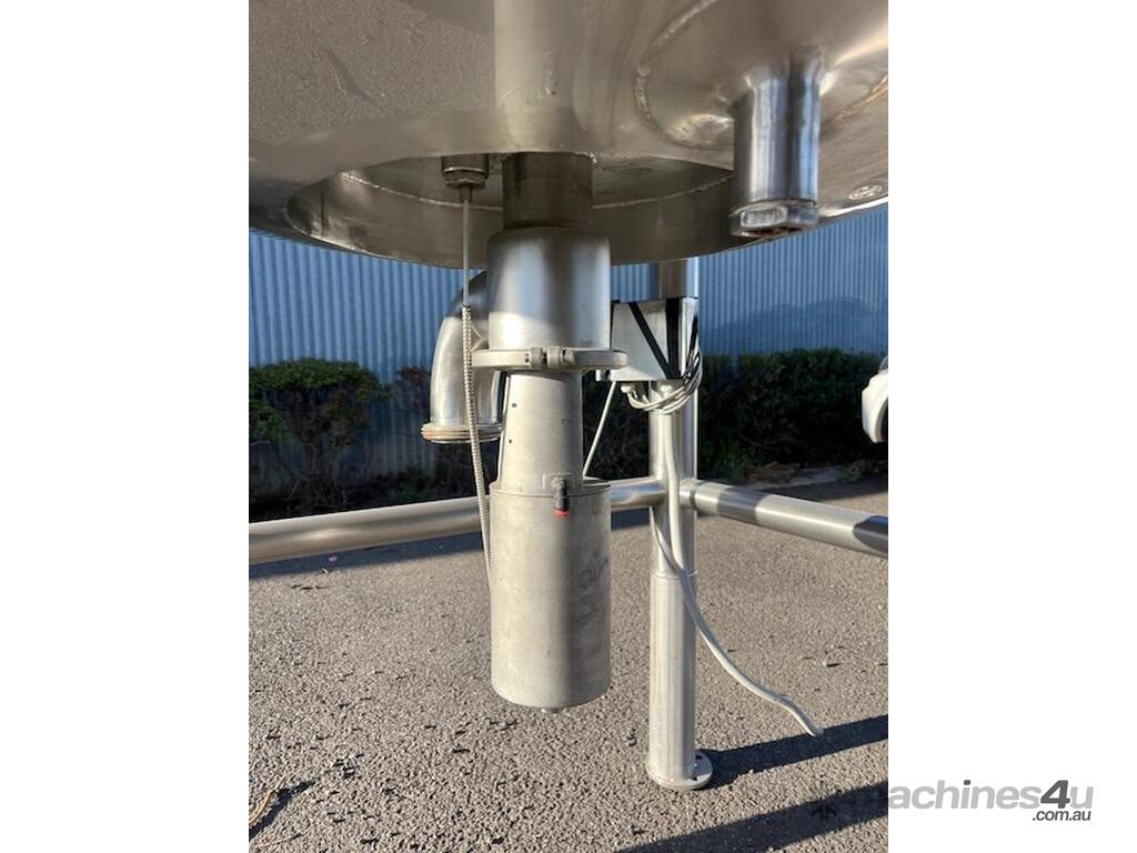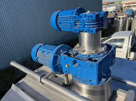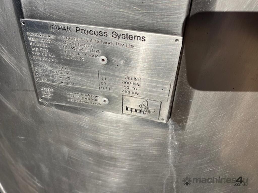 A quality Australian-built IOPAK Process Systems jacketed mixing vessel is now available for immediate sale. Constructed in food-grade 316 stainless steel with a polished interior, this tank is fitted with a dual top-mounted motor drive powering a planetary anchor agitator complete with wall scraper blades – perfect for heating, mixing, and processing viscous or temperature-sensitive products. The steam or hot water jacket is rated to 300 kPa at 150°C, and the vessel includes internal CIP spray ball for hygienic clean-in-place wash down. Mounted on a sturdy stainless steel leg frame, this vessel is ready to work in your food, dairy, sauce, confectionery, cosmetic, or pharmaceutical processing facility.