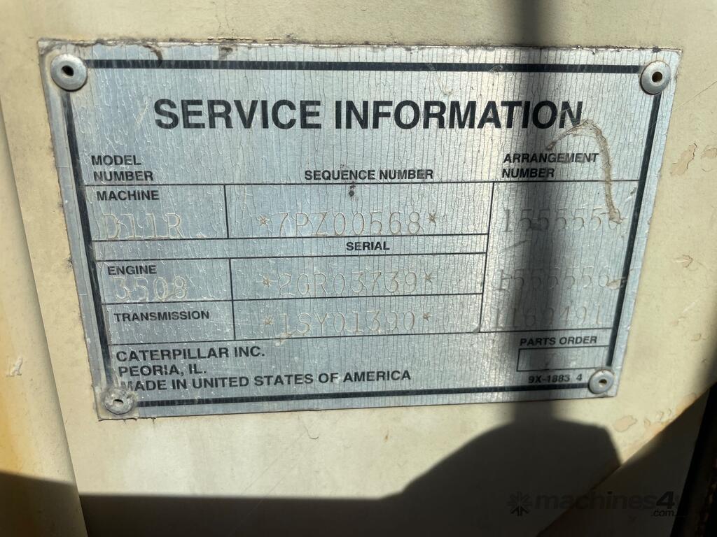 CP: 01/2001,Built: 01/2001,Caterpillar,D11R,Dozer,34.5 Ltr,8 Cyl,Diesel Turbo,Odometer not visible,69214 (Hrs. Showing on Hour meter),Colour: Yellow,Unregistered,Serial No: 7PZ00568,Sold with No Plates