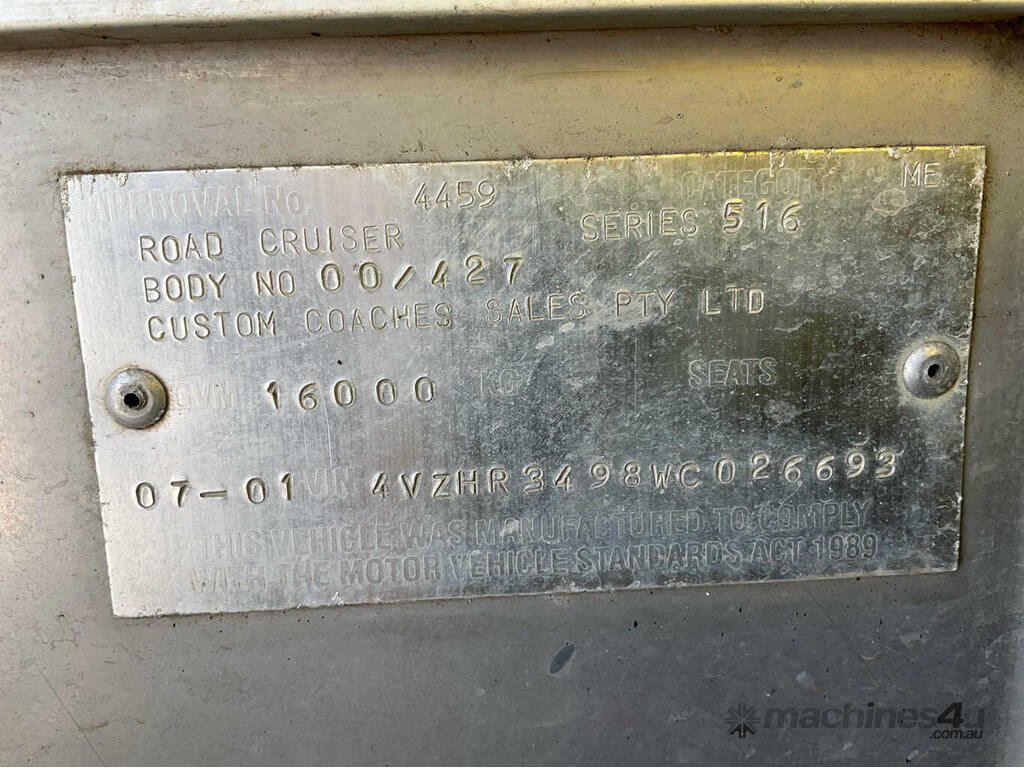 CP: 07/2001,Custom Coaches,Road Cruiser,Bus,Automatic,Airbag,6 Cyl,Diesel,Turbo,3965984 (Kms. Showing on Odometer),Hourmeter not visible,Colour: White,Unregistered,VIN: 4VZHR3498WC026693,Key No: 417E,Length: 12.2 m,GVM: 16000,Sold with No Plates,Key No: 417E