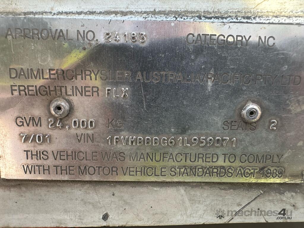CP: 07/2001,Freightliner,FLX C120,Tipper,Manual,Airbag,Cummins,6 Cyl,Diesel,Turbo,434091 (Kms. Showing on Odometer),12850 (Hrs. Showing on Hour meter),Colour: White,Rego. No: NP(XN28QO), Unregistered NSW,VIN: 1FVHBBBG61L959071,Key No: 89,Length: 8.2 m,GVM: 24000,GCM: 55000,Sold with No Plates,WOVR Status: Repairable Write-Off,Incident Type: Impact,Key No: 89