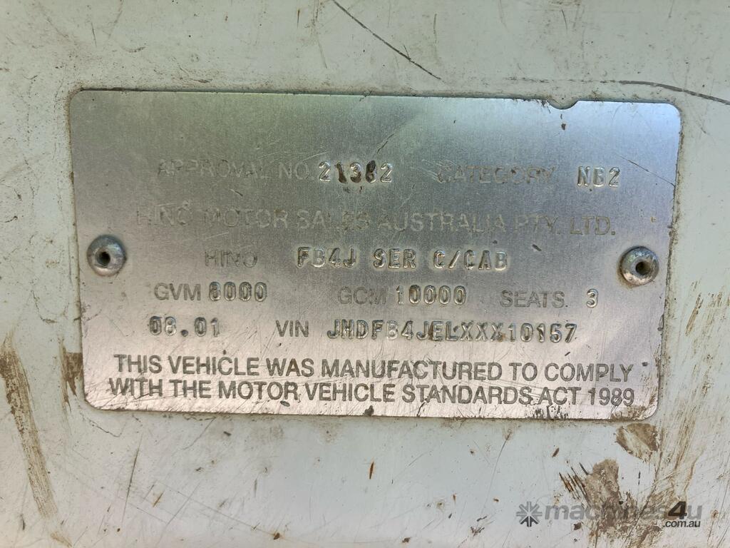 CP: 08/2001,Hino,FB4J,Tipper,Manual,Spring,Engine #: J05C,4 Cyl,Diesel,5 Gears,248818 (Kms. Showing on Odometer),Hourmeter not visible,Colour: White,Rego. No: BX39SC NSW,VIN: JHDFB4JELXXX10157,Length: 6.5 undefined,GVM: 8000,GCM: 10000,Sold with No Plates
