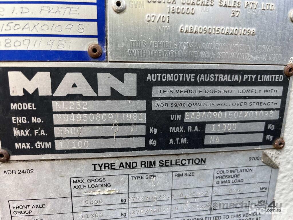 CP: 07/2001,MAN,NL232,Bus,Automatic,Air Bag ,6 Cyl,CNG,Odometer not visible,Hourmeter not visible,Colour: Yellow,Unregistered,VIN: 6ABA090150AX01098,GVM: 18000,Sold with No Plates,WOVR Status: WOVR N/A