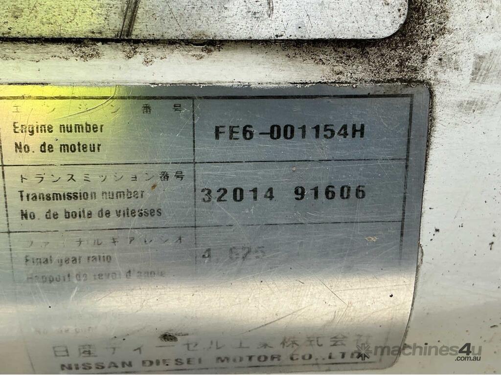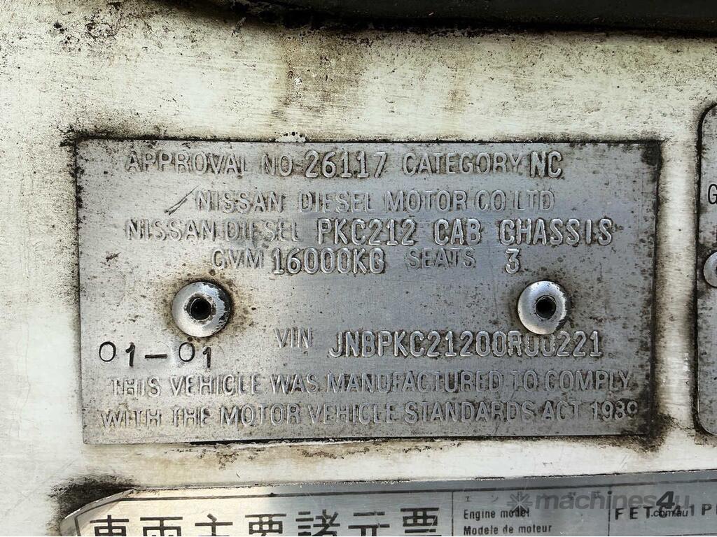 CP: 01/2001,Nissan UD,PKC212,Cab Chassis,Manual,Airbags ,Engine #: FE6001154H,6 Cyl,Diesel Turbo,9 Gears,841331 (Kms. Showing on Odometer),Hourmeter not visible,Colour: White,Unregistered,VIN: JNBPKC21200R00221,Key No: 43S,Length: 11.3 m,GVM: 16000,GCM: 26000,Sold with No Plates,Key No: 43S
