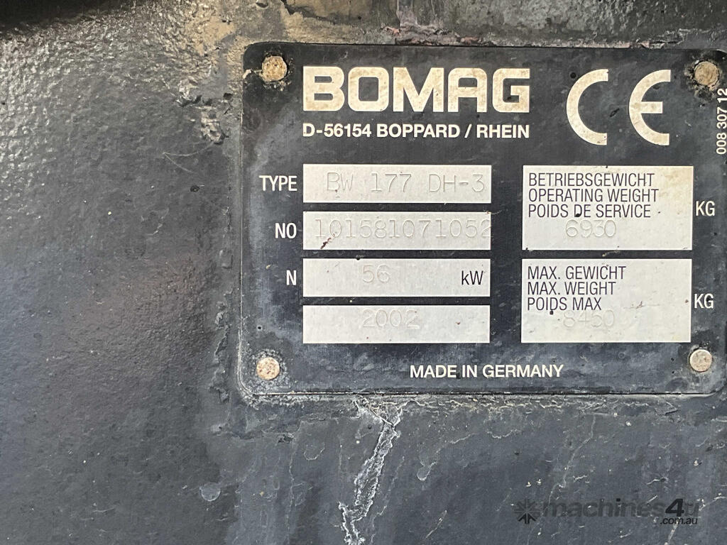 CP: CIRCA 2002,Bomag,BW177DH-3,Articulated Smooth Drum Roller,Diesel,Odometer not visible,4339 (Hrs. Showing on Hour meter),Colour: Yellow,Unregistered,Serial No: 52,ROPS No: 581,FOPS No: 581,Sold with No Plates