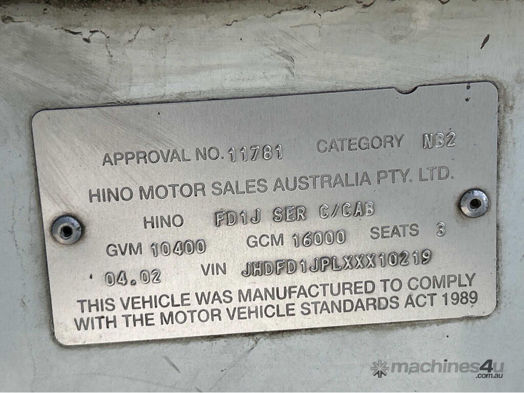 CP: 04/2002,Hino,FD1J,Curtainsider Day Cab,Manual,Spring Suspension ,Engine #: J08CF19761,J08C,6 Cyl,Diesel,6 Gears,694176 (Kms. Showing on Odometer),Hourmeter not visible,Colour: White,Unregistered,VIN: JHDFD1JPLXXX10219,Key No: 4,Length: 11.5 undefined,GVM: 10400,GCM: 16000,Sold with No Plates,Key No: 4