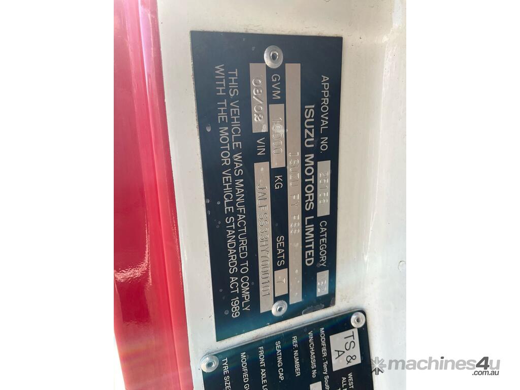 CP: 08/2002,Isuzu,FSS,Fire Truck (Dual Cab),Manual,leaf spring suspension ,6 Cyl,Diesel,5 Gears,48387 (Kms. Showing on Odometer),1368 (Hrs. Showing on Hour meter),Colour: Red,Unregistered WA,VIN: JALFSS33HY7000101,Key No: 186,GVM: 10000,GCM: 15000,Sold with No Plates,Key No: 186