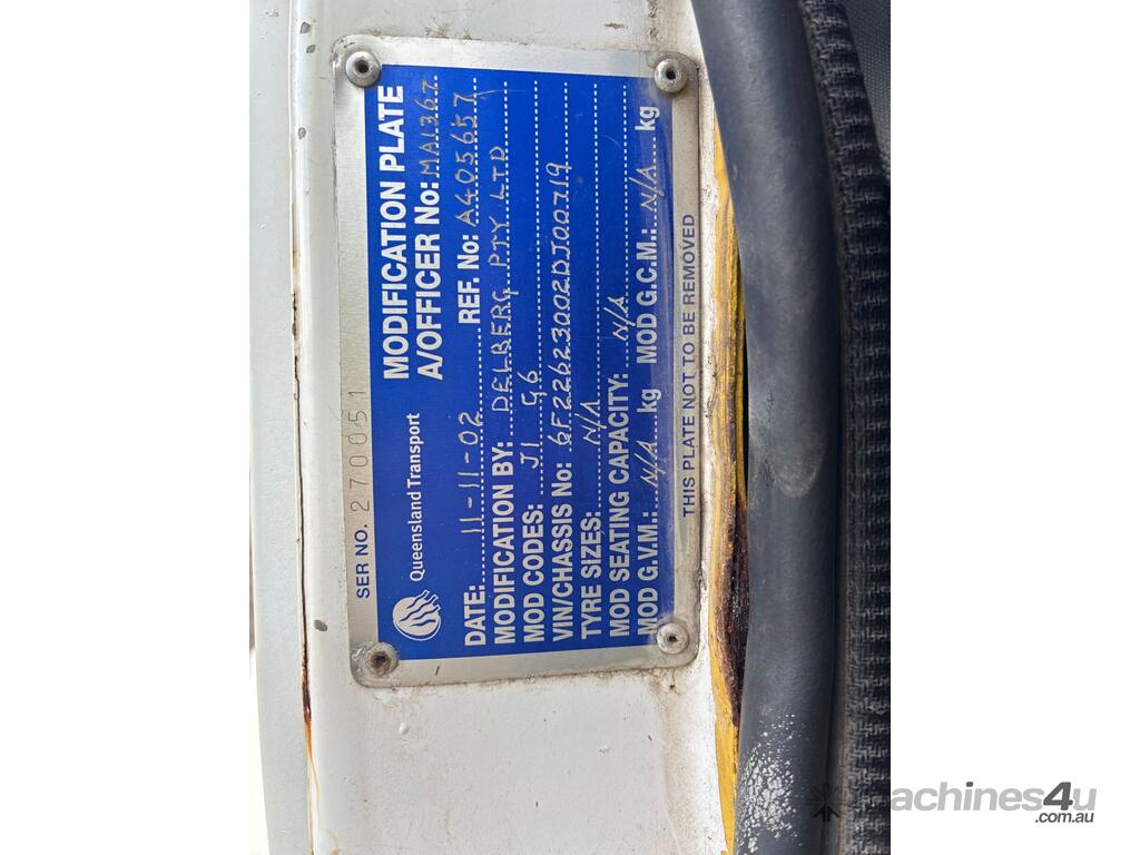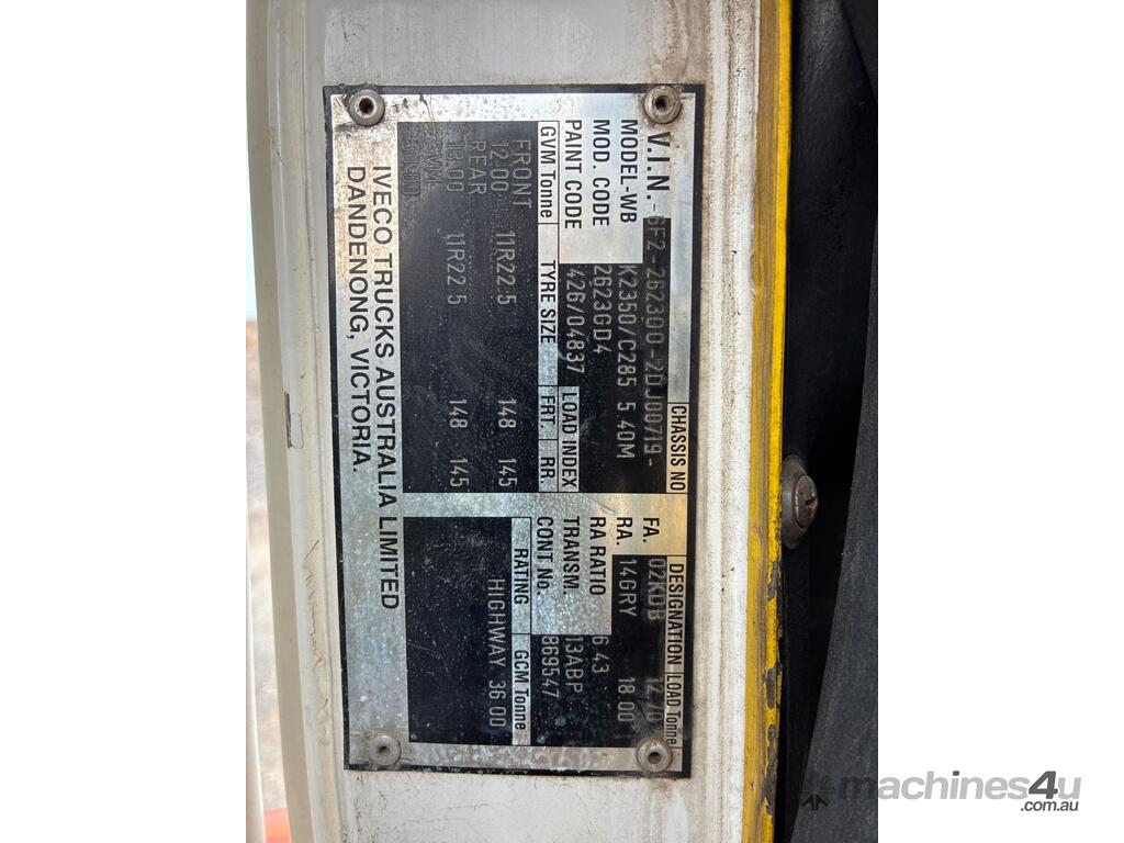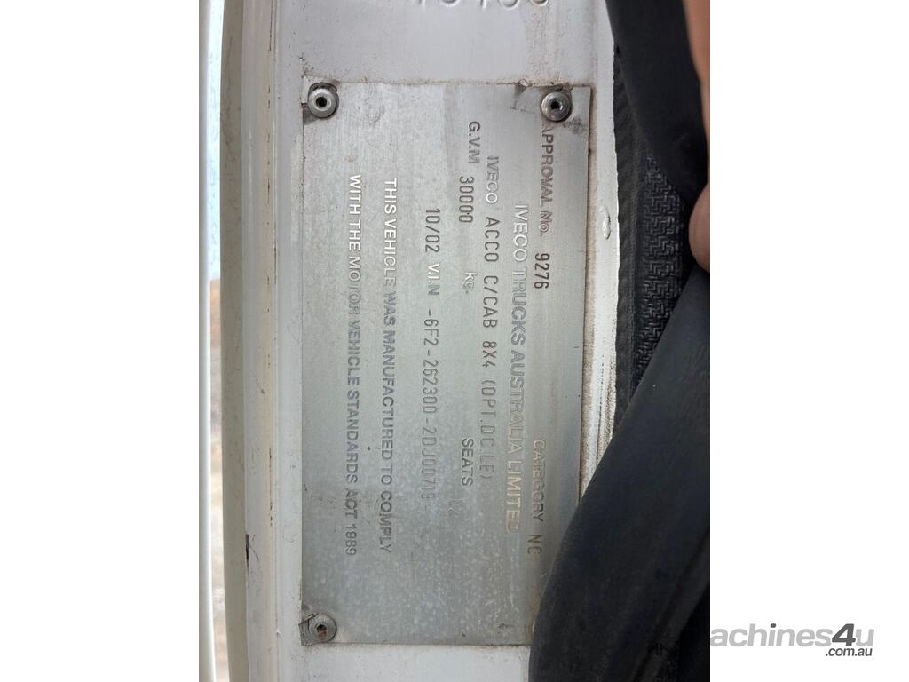 CP: 10/2002,Iveco,ACCO 2350,Water Cart,Automatic,Cummins,6 Cyl,Diesel,280480 (Kms. Showing on Odometer),23392 (Hrs. Showing on Hour meter),Colour: White,Unregistered,VIN: 6F22623002DJ00719,GVM: 30000,GCM: 36000,Sold with No Plates