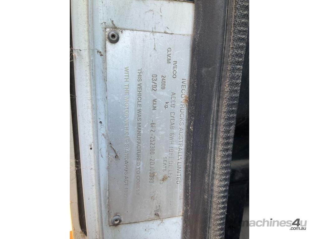 CP: 03/2002,Iveco,ACCO 2350G,Table Top,Automatic,Airbag Suspension,Diesel,343600 (Kms. Showing on Odometer),24316 (Hrs. Showing on Hour meter),Rego. No: NP(XB04DI), Unregistered VIC,VIN: 6F22523002DJ00099,Key No: 82,GVM: 24000,GCM: 36000,Sold with No Plates,Key No: 82
