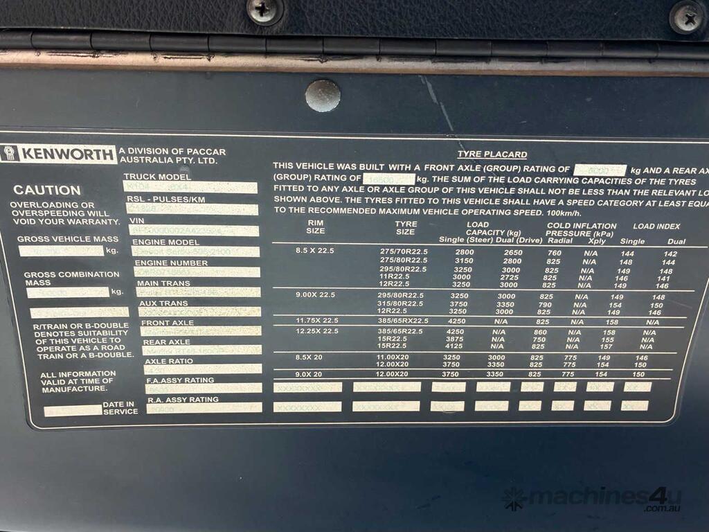 CP: 11/2002,Kenworth,K104,Prime Mover,Manual,Airbag,6 Cyl,Diesel,Odometer not visible,Hourmeter not visible,Colour: Blue,Unregistered,VIN: 6F50000002A423524,Key No: 43,GVM: 26000,Sold with No Plates,Key No: 43