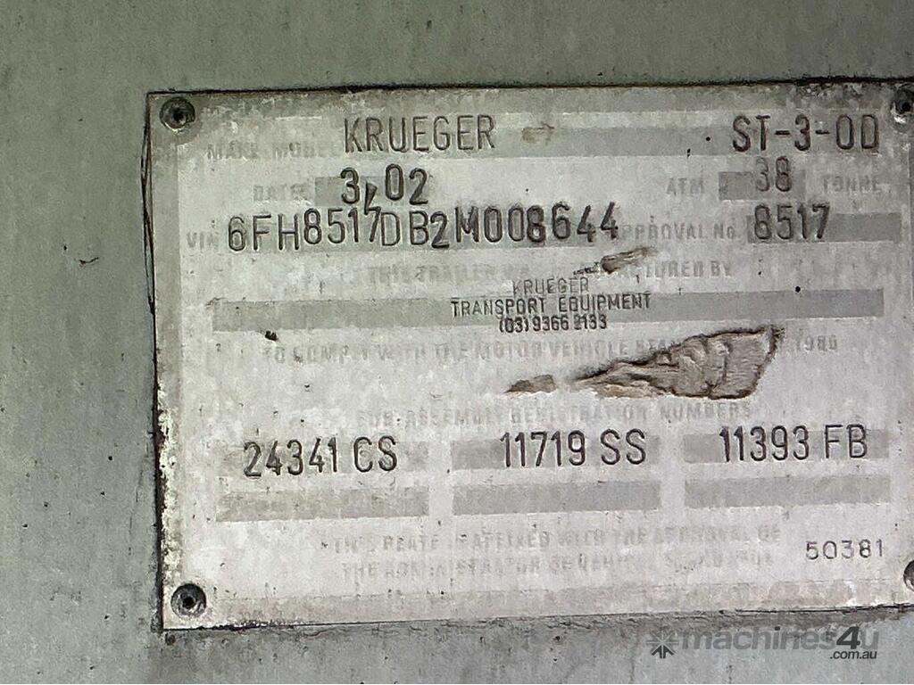 CP: 03/2002,Krueger,ST-3-OD,47ft,Tri Axle Drop Deck Trailer,34555 (Kms. Showing on Hubometer),Colour: Blue,Rego. No: YO46JF NSW,Rego expiry: 02/06/2026,VIN: 6FH8517DB2M008644,Sold with No Plates