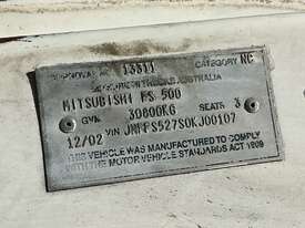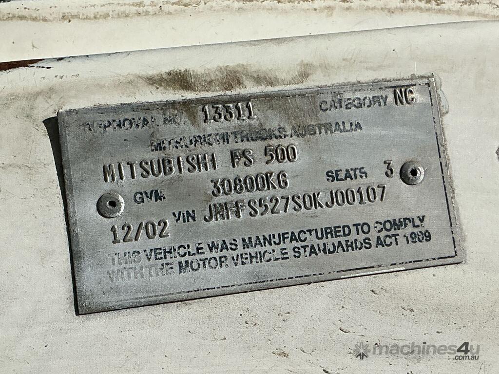 CP: 12/2002,Mitsubishi,FS500,Vacuum Truck,Manual,Leafspring,Engine #: 6D24326722,6 Cyl,Diesel Turbo,321412 (Kms. Showing on Odometer),Hourmeter not visible,Colour: White,Unregistered VIC,VIN: JMFFS527S0KJ00107,GVM: 30800,GCM: 50000,Sold with No Plates,WOVR Status: WOVR N/A