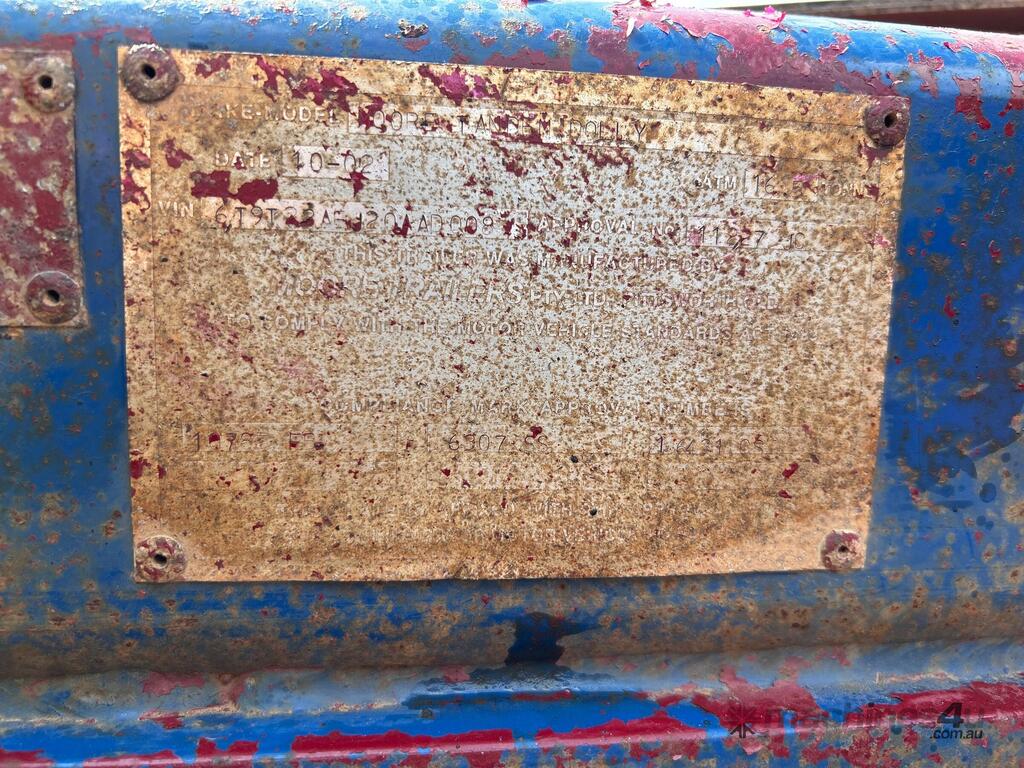 CP: 10/2002,Moore,Dual Axle Dolly,Hubometer not visible,Rego. No: NP(534QQZ), Unregistered QLD,VIN: 6T9T23AEJ20AAD008,Sold with No Plates