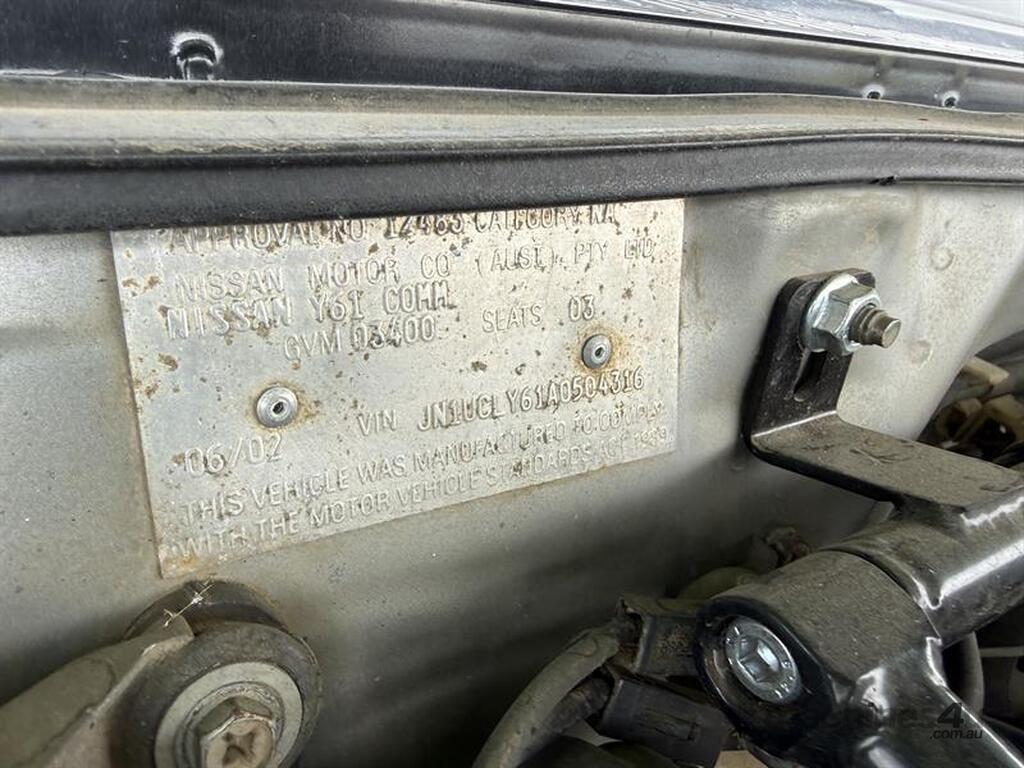 2002 NISSAN PATROL DX UTE, VIN: JN1UCLY61A0504316, E/N: ###, 352,184KM SHOWING, NO REGISTRATION, CURRENT RWC. LOCATION: HALFERTY STREET, EMERALD, QLD 4720. INSPECTIONS & COLLECTIONS: MONDAY TO FRIDAY, 8AM TO 4PM. ENQUIRIES: RYAN OGDEN BROWN ON OR RYANEMERALDAUCTIONCENTRE