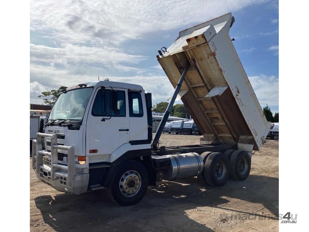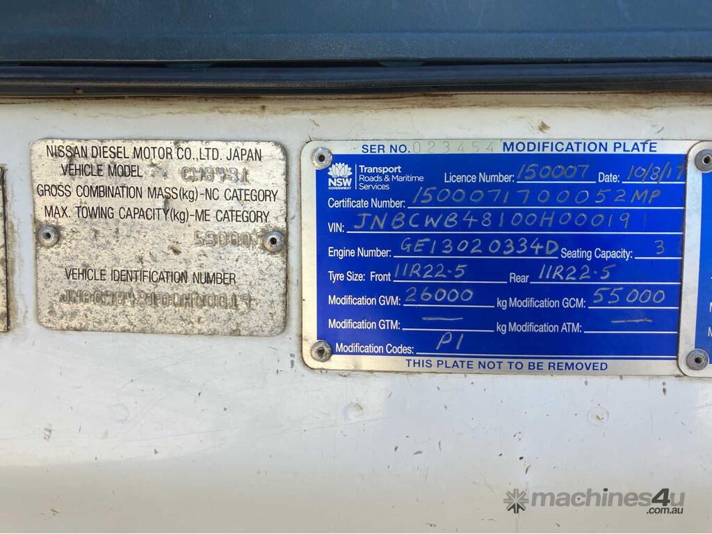 CP: 08/2002,Nissan Diesel,CWB,Tipper,Manual,Spring,Engine #: GE13TD-11,6 Cyl,Diesel,Turbo,16033 (Kms. Showing on Odometer),Hourmeter not visible,Colour: White,Rego. No: AY03DX NSW,VIN: JNBCWB48100H00019,Length: 7.2 m,GVM: 26000,GCM: 55000,Sold with No Plates