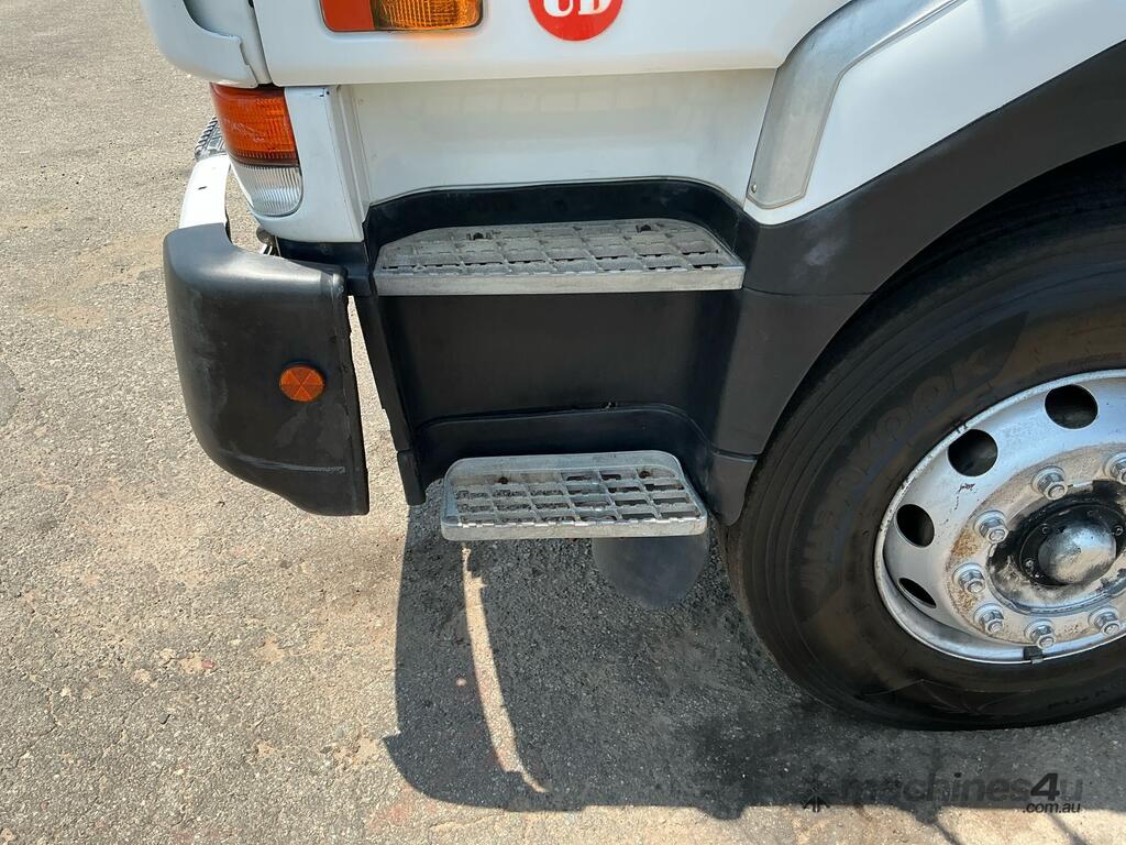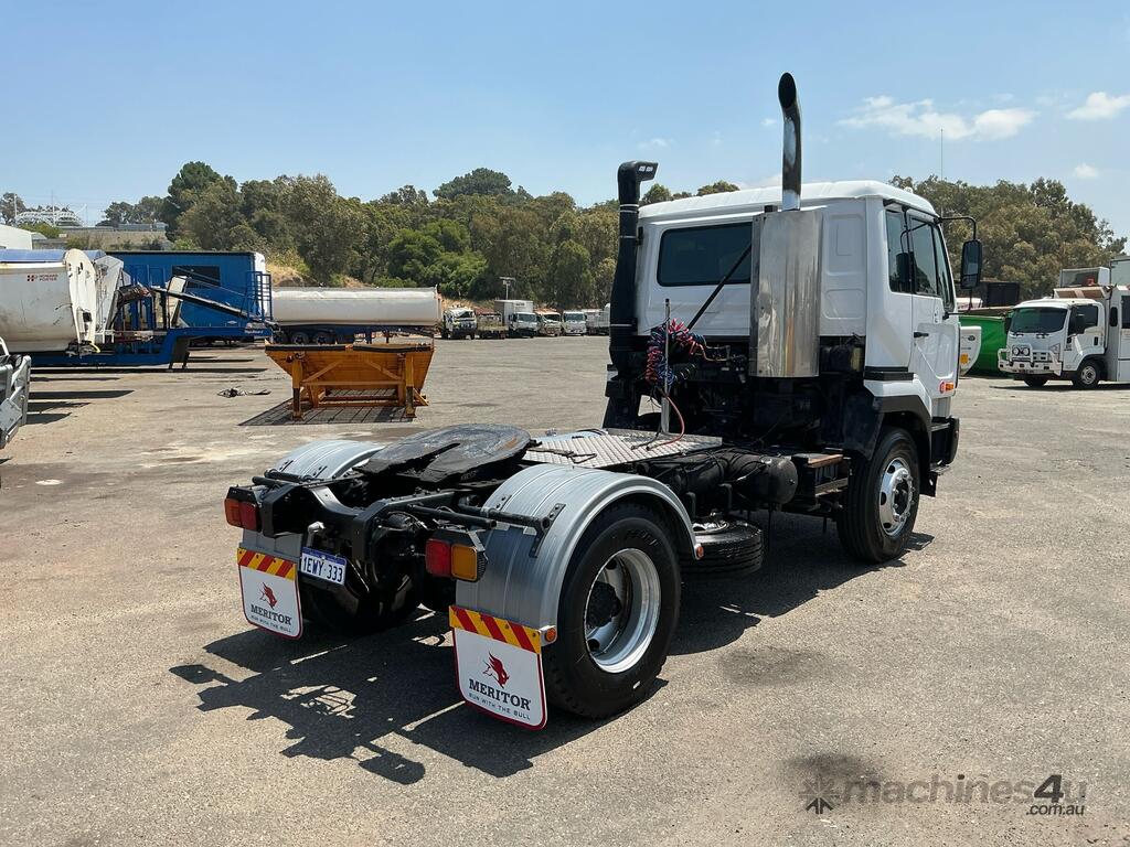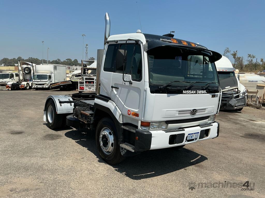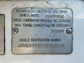 CP: 02/2002,Nissan UD,CK320,Prime Mover,Manual,Spring,6 Cyl,Diesel Turbo,616227 (Kms. Showing on Odometer),Hourmeter not visible,Colour: White,Rego. No: NP(1EWY333), Unregistered WA,VIN: JNBCKB45500C00064,Key No: 62,Length: 17 ft,GVM: 17500,GCM: 38000,Sold with No Plates,Key No: 62