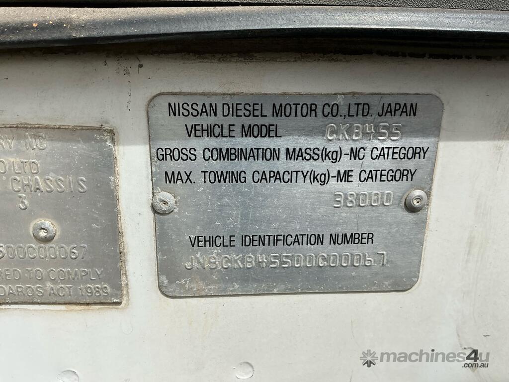 CP: 08/2002,Nissan UD,CKB455,Prime Mover,Manual,Spring ,6 Cyl,Diesel,300983 (Kms. Showing on Odometer),Hourmeter not visible,Colour: White,Rego. No: NP(RNR621), Unregistered VIC,VIN: JNBCKB45500C00067,Length: 6.1 m,GVM: 17500,GCM: 38000,Sold with No Plates
