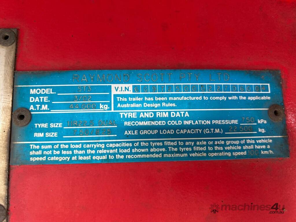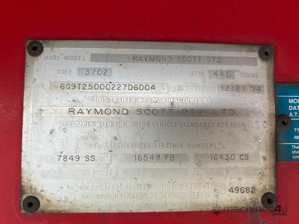 CP: 03/2002,Raymond,Tri Axle Curtainside A Trailer,292113 (Kms. Showing on Hubometer),Colour: Red,Rego. No: NP(YS24BP), Unregistered NAT,VIN: 6G9T25000227D6004,Sold with No Plates