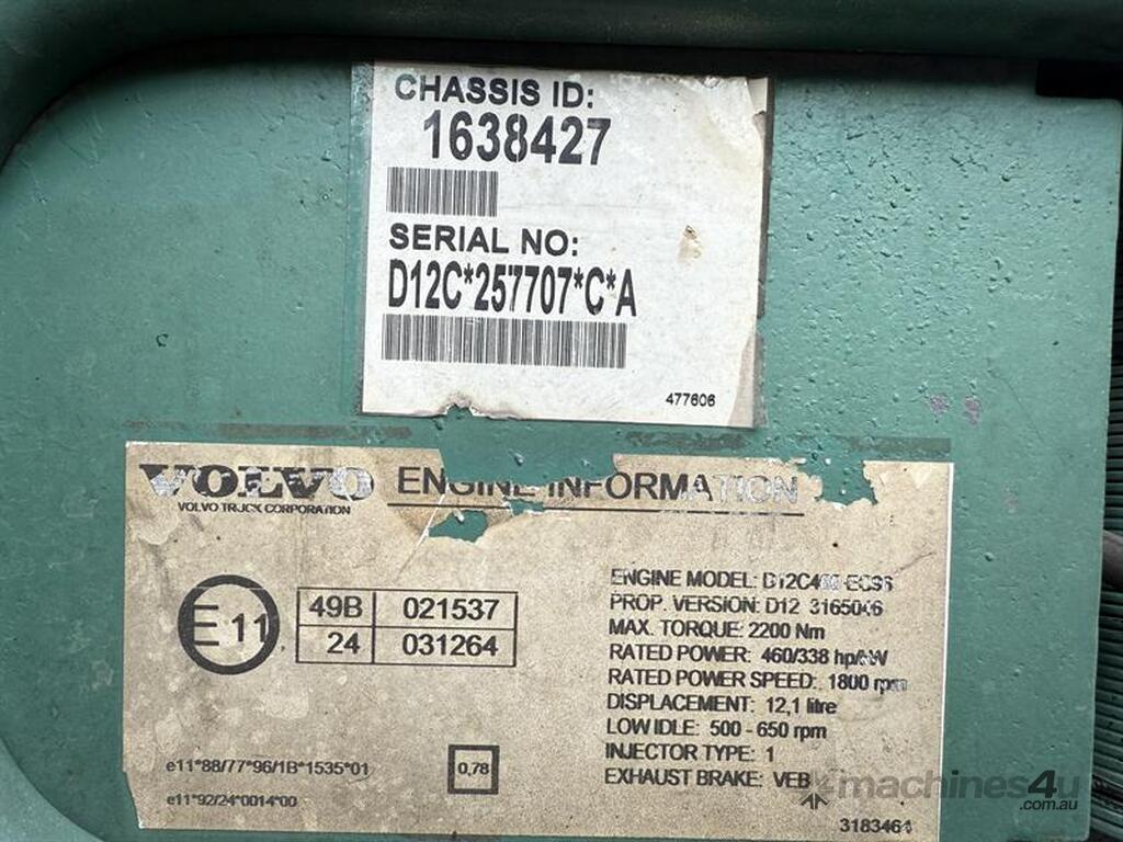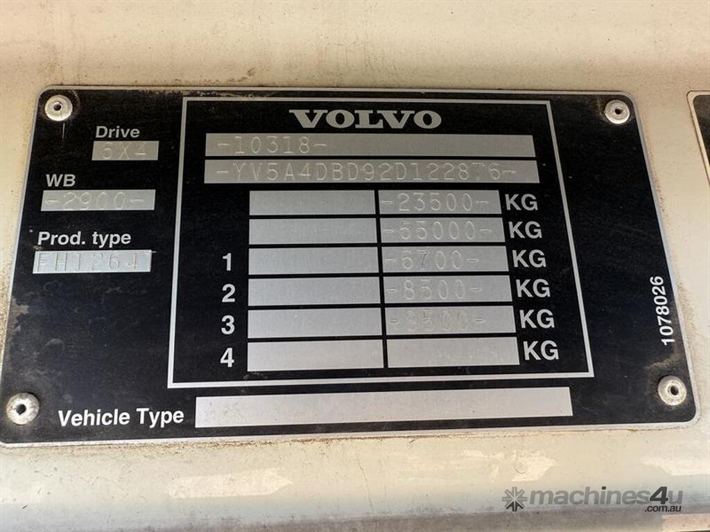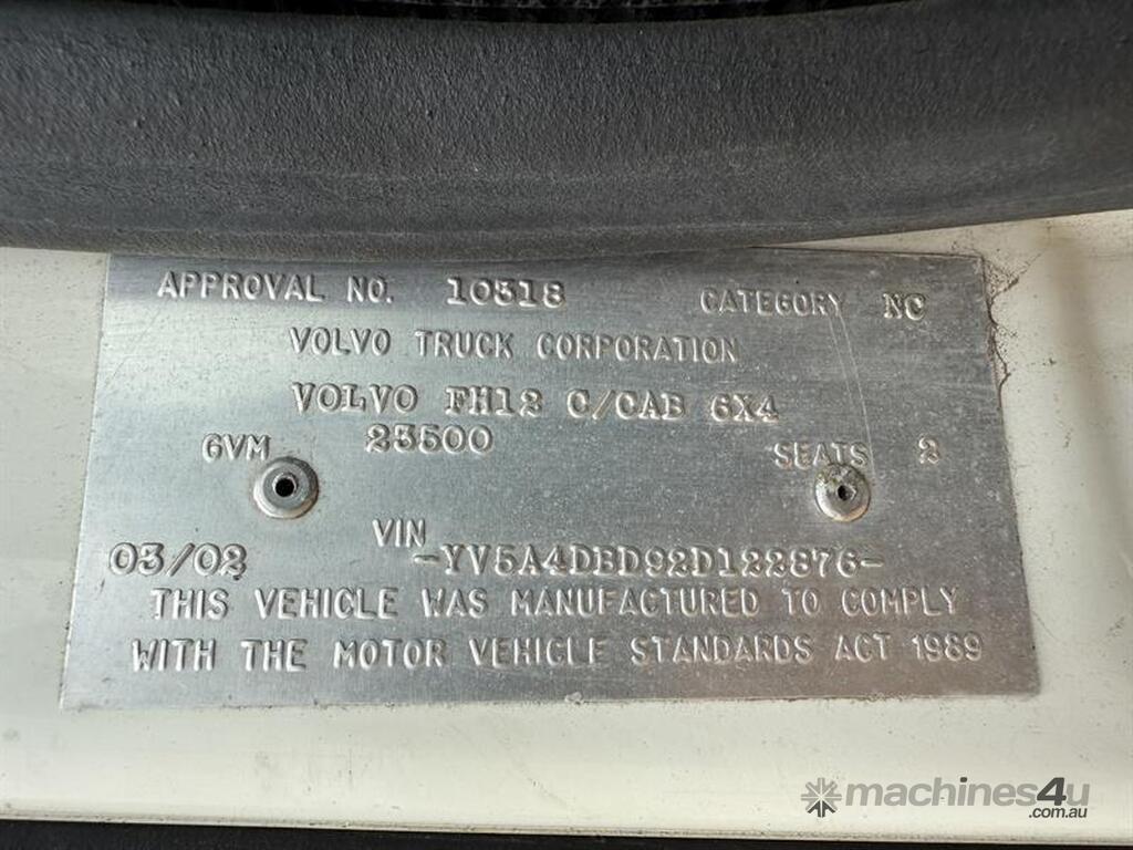 2002 VOLVO FH12 PRIME MOVER, VIN: YV5A4DBD92D122876, E/N: 257707, 1,106,543KM SHOWING, NO REGISTRATION, NO COI. LOCATION: BUNDABERG, QLD 4670. INSPECTIONS & COLLECTIONS: BY APPOINTMENT ONLY. ENQUIRIES: JOHN MCDOUGALL ON OR JOHNEMERALDAUCTIONCENTRE