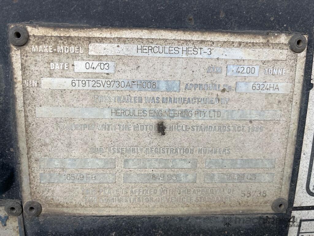 CP: 04/2003,Hercules,HEST-3,Tri Axle Tipping Trailer,89274 (Kms. Showing on Hubometer),Rego. No: YS63DF,VIN: 6T9T25V9730AFH008,Sold with No Plates,WOVR Status: Statutory Write-Off,Incident Type: Impact