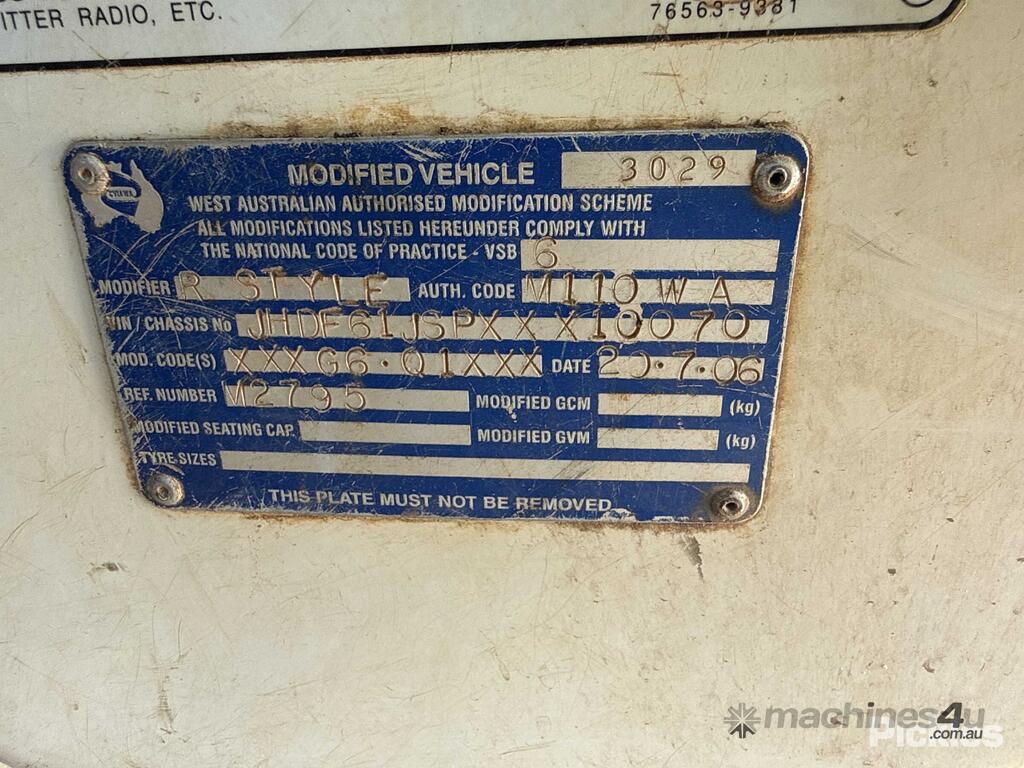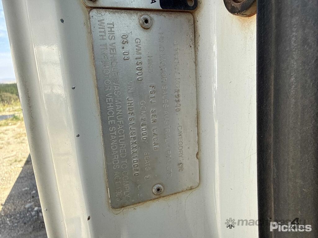CP: 05/2003,Hino,FG1J,Flat Top Crane,Manual,Spring Suspension ,6 Cyl,Diesel Turbo,6 Gears,143582 (Kms. Showing on Odometer),3906 (Hrs. Showing on Hour meter),Colour: White,Unregistered,VIN: JHDFG1JSPXXX10070,GVM: 15000,GCM: 24000,Sold with No Plates