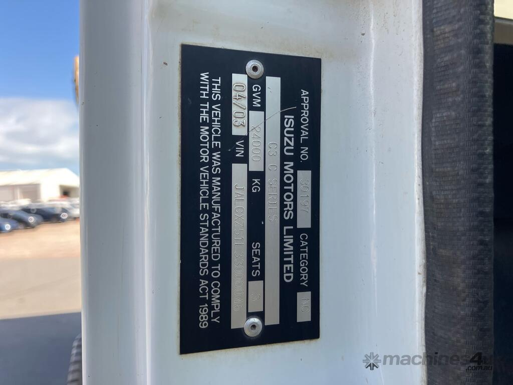 CP: 04/2003,Isuzu,CXZ,Tipper,Manual,Spring,6 Cyl,Diesel,18 Gears,543293 (Kms. Showing on Odometer),Hourmeter not visible,Colour: White,Rego. No: XB68IY,VIN: JALCXZ51L33000046,Length: 7.5 m,GVM: 24000,GCM: 50000,Sold with No Plates