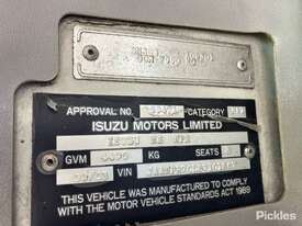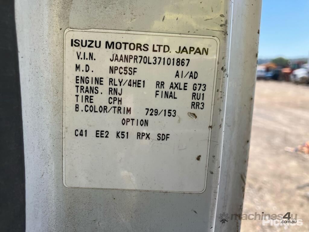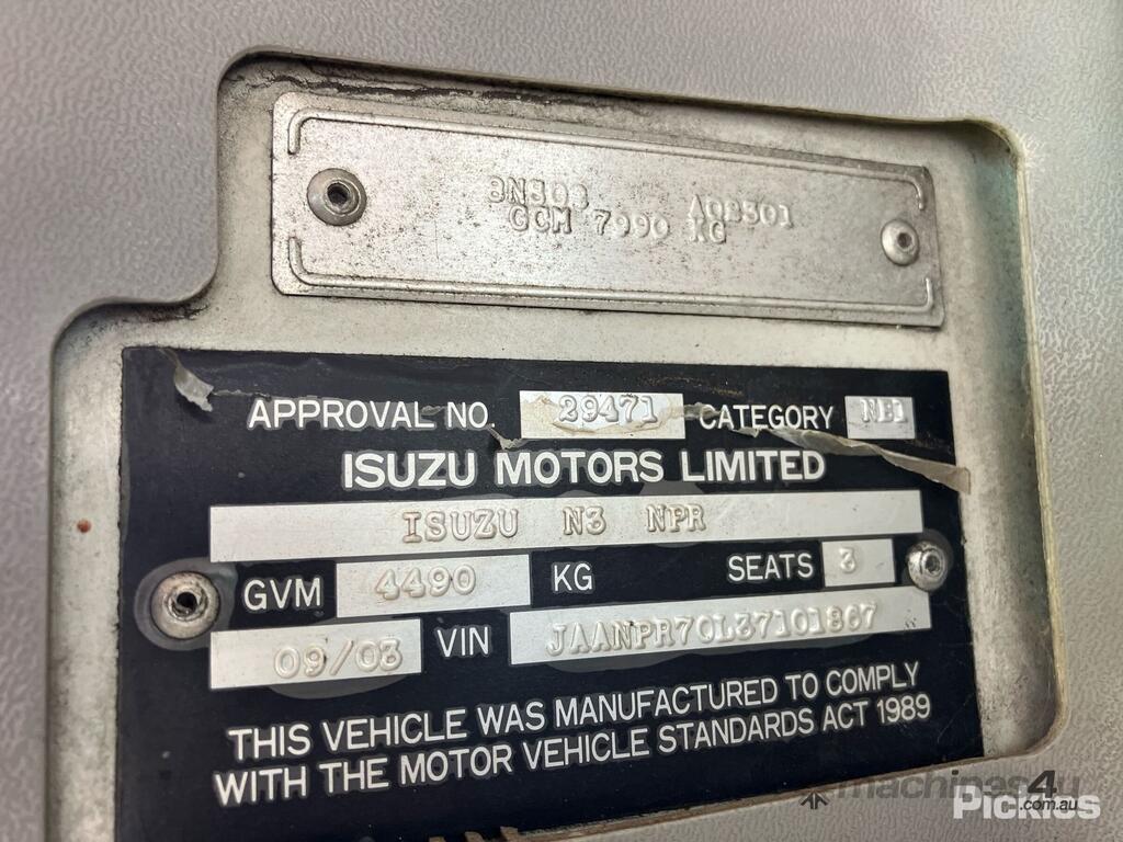CP: 09/2003,Isuzu,NPR,Crane Truck (Table Top),Engine #: RLY/4HE1,4 Cyl,Diesel,Turbo,450296 (Kms. Showing on Odometer),Hourmeter not visible,Colour: White,Rego. No: LZYBOY NSW,VIN: JAANPR70L37101867,Length: 6 m,GVM: 4490,GCM: 7990,Sold with No Plates,WOVR Status: WOVR N/A,Incident Type: Impact