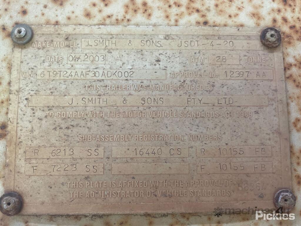 CP: 04/2003,Built: 04/2003,J Smith & Sons,JSDT-4-20,Quad Axle Widening Dog Trailer,Hubometer not visible,Colour: White,Rego. No: NP(858UCH), Unregistered QLD,VIN: 6T9T24AAF30ADK002,Sold with No Plates