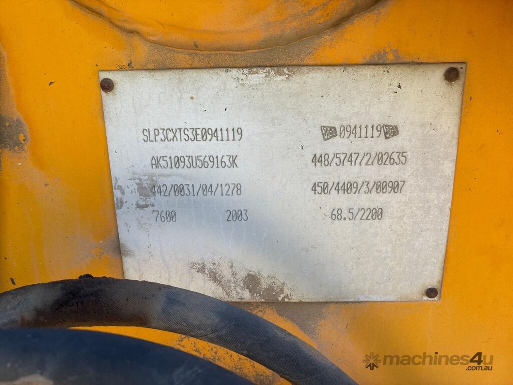 CP: CIRCA 2003,JCB,3CX,Backhoe,Diesel,Odometer not visible,504 (Hrs. Showing on Hour meter),Colour: Yellow,Rego. No: NP(UHK554), Unregistered,VIN: SLP3CXTS3E0941119,Serial No: 0941119,Sold with No Plates
