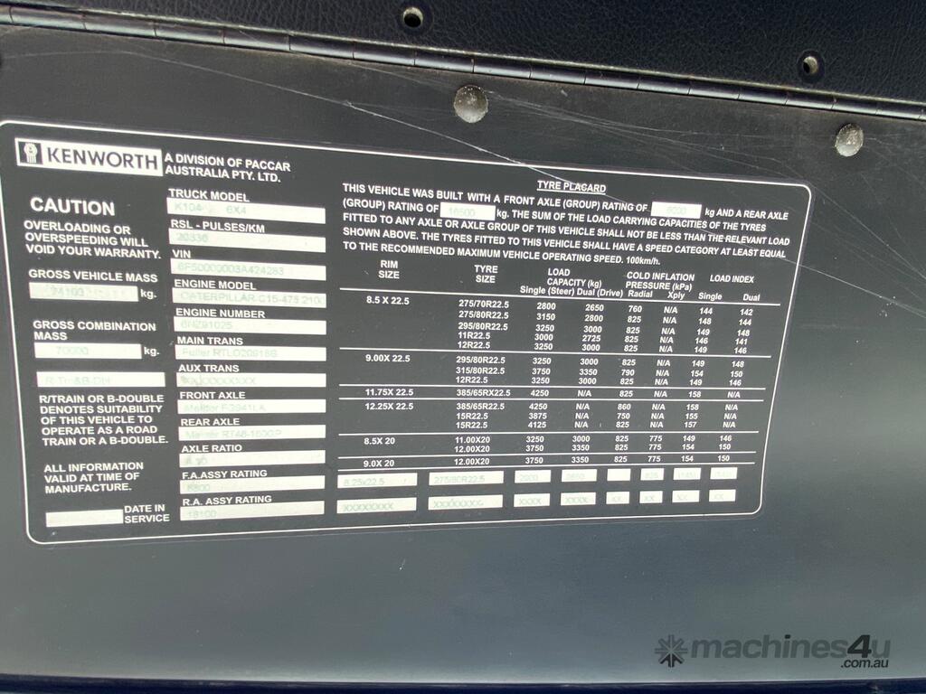 CP: 05/2003,Built: 05/2003,Kenworth,K104 Aerodyne,Prime Mover,Manual,Air Bag Suspension,Engine #: 6NZ91025,Caterpillar C15,6 Cyl,Diesel,18 Gears,679228 (Kms. Showing on Odometer),Hourmeter not visible,Colour: White,Rego. No: CM43PT NSW,Rego expiry: 14/09/2026,VIN: 6F50000003A424283,GVM: 24100,GCM: 70000,Plates to All