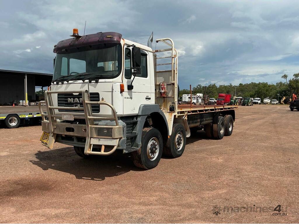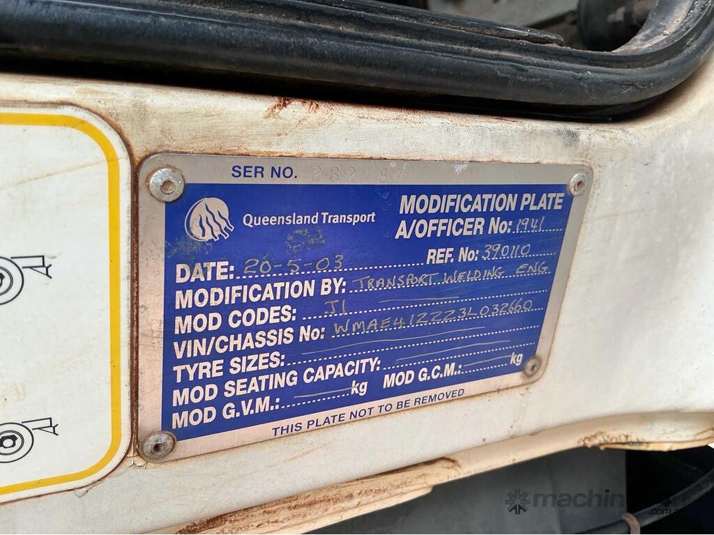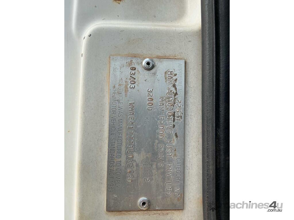 CP: 03/2003,MAN,FE32.410,Table Top,Leaf Springs ,Man,6 Cyl,Diesel,8 Gears,115279 (Kms. Showing on Odometer),Hourmeter not visible,Colour: White,Rego. No: 833845 NT,VIN: WMAE41ZZZ3L032660,Length: 10.1 m,GVM: 32000,Sold with No Plates