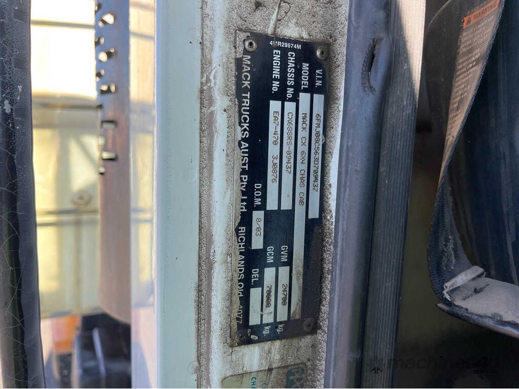 CP: 08/2003,Mack,CX,Water Cart,Manual,Airbag ,6 Cyl,Diesel Turbo,18 Gears,170827 (Kms. Showing on Odometer),31127 (Hrs. Showing on Hour meter),Colour: White,Unregistered,VIN: 6FMJ08C563D709437,Key No: P101,Length: 7.8 m,GVM: 24700,GCM: 70000,Sold with No Plates,Key No: P101