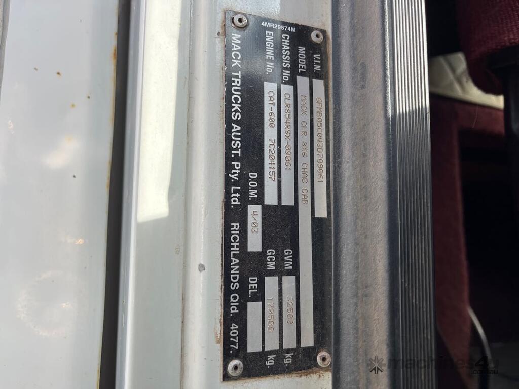 CP: 04/2003,Mack,Titan,Manual,Air Bag ,Engine #: 80053304,6 Cyl,Diesel Turbo,18 Gears,Odometer not visible,Hourmeter not visible,Colour: White,Rego. No: CF05TK NT,VIN: 6FMB05C043D709061,GVM: 32500,GCM: 170500,Sold with No Plates