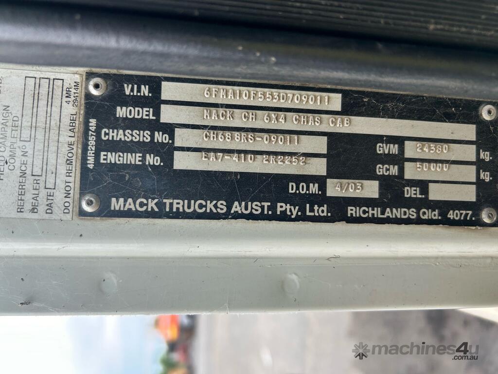 CP: 04/2003,Mack,Value Liner,Cab Chassis,Automatic,Airbag,6 Cyl,Diesel,Odometer not visible,Hourmeter not visible,Colour: White,Unregistered,VIN: 6FMA10F553D709011,Key No: 2,GVM: 24380,GCM: 50000,Sold with No Plates,WOVR Status: WOVR N/A,Incident Type: Not Applicable,Key No: 2