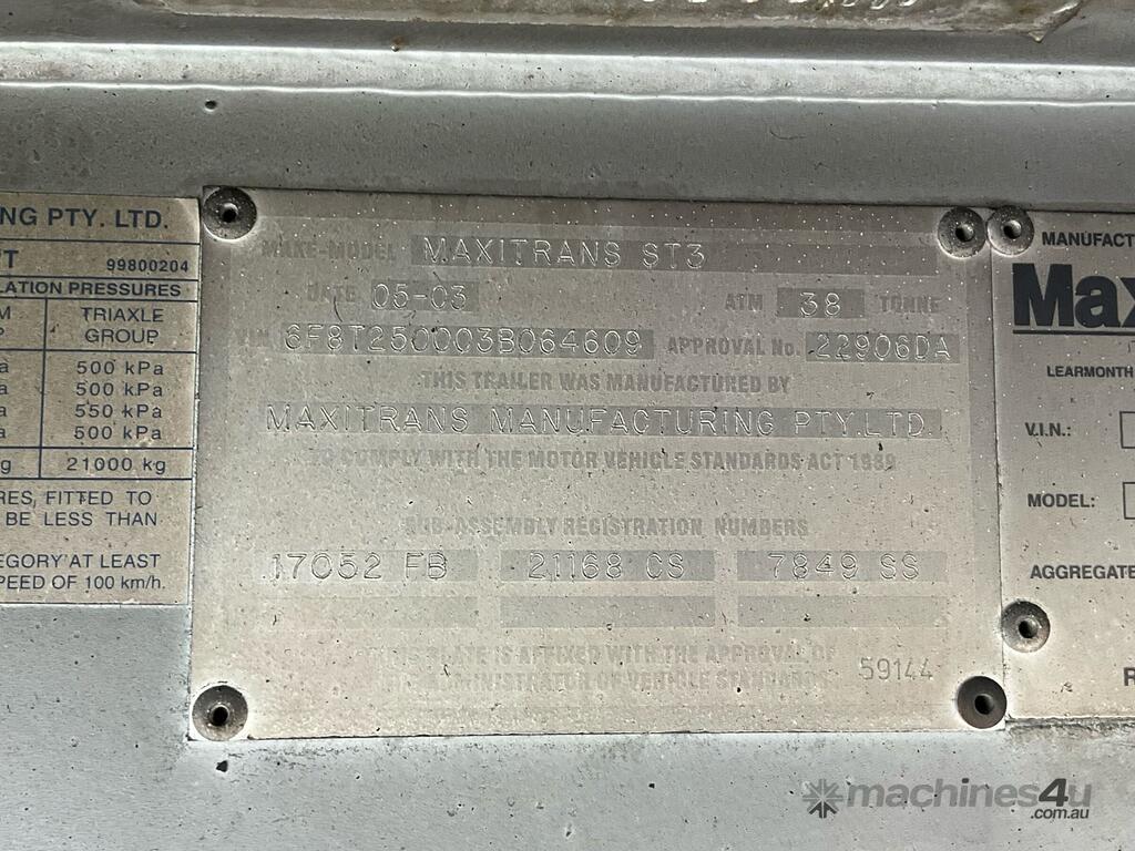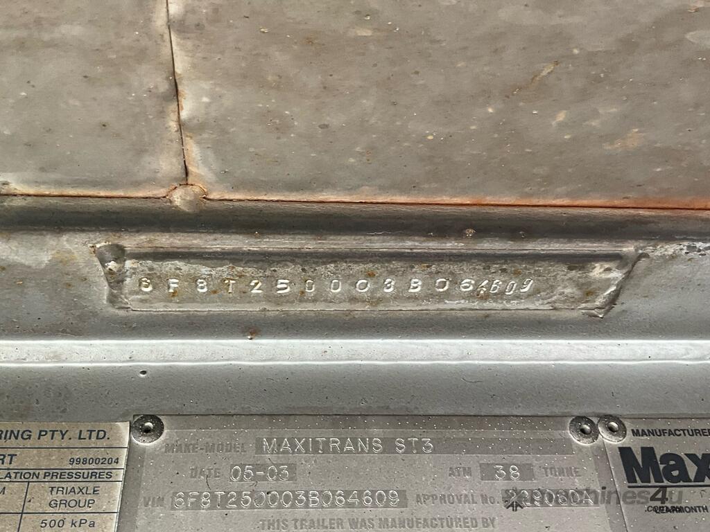 CP: 05/2003,Maxitrans,ST3,Tri Axle Curtainside B Trailer,Hubometer not visible,Colour: Blue,Rego. No: NP(P80105), Unregistered NSW,VIN: 6F8T250003B064609,Sold with No Plates,WOVR Status: Statutory Write-Off,Incident Type: Fire