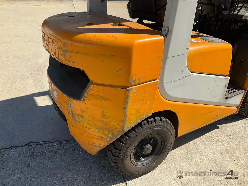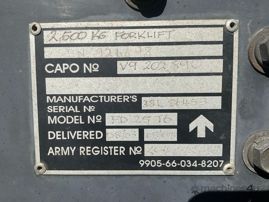 CP: 08/2003,TCM,FD25T6,Diesel Forklift,4 Cyl,Diesel,Odometer not visible,1529 (Hrs. Showing on Hour meter),Colour: Yellow,Rego. No: NP(204726), Unregistered,Serial No: 38L86453,Sold with No Plates