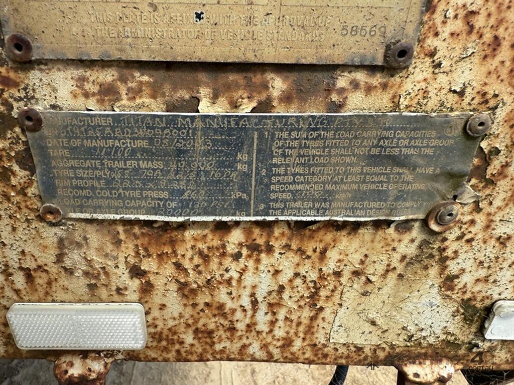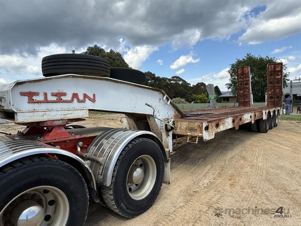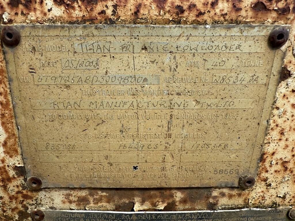 2003 TITAN WIDENING LOW LOADER. VIN 6T9T25ABD3009B001. Registered to April 2026, will be sold unregistered per the auction T&C's. Trailer has just been over the pits. Spring suspension. Powered by truck hydraulics, also does have a power pack on board which is not connected. 3.4 metre widener. 1050mm deck height. 9.3 metres of usable deck. 13 metres from rear to pin. Current vendor has owned this float for 20 years. Located East of Bathurst, NSW