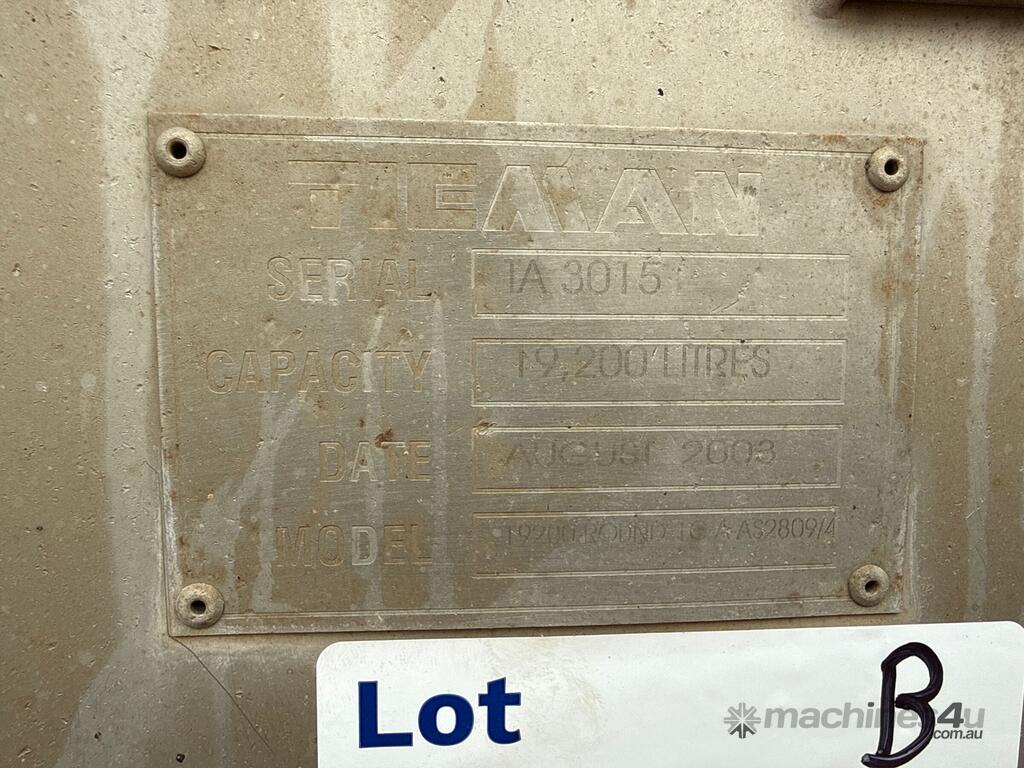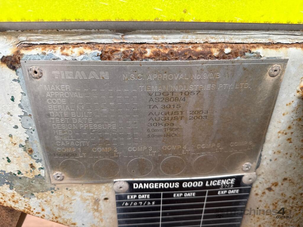 CP: 08/2003,Built: 08/2003,Tieman,Tri Axle Liquid Tanker Trailer,372028 (Kms. Showing on Hubometer),Colour: Grey,Rego. No: SY14CG SA,VIN: 6B9TA30153MAC1015,Sold with No Plates