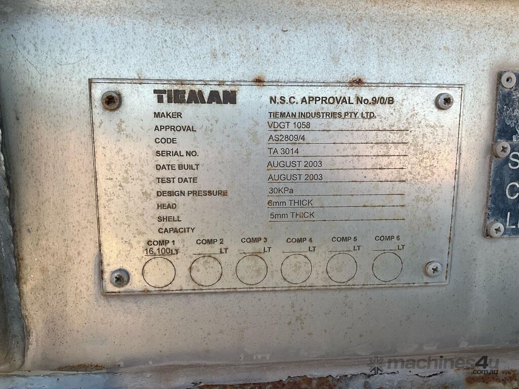 CP: CIRCA 2003,Tieman,Tri Axle Liquid Tanker Trailer,664319 (Kms. Showing on Hubometer),Colour: Silver,Rego. No: SY35CF SA,VIN: 6B9TA30143MAC1014,Sold with No Plates