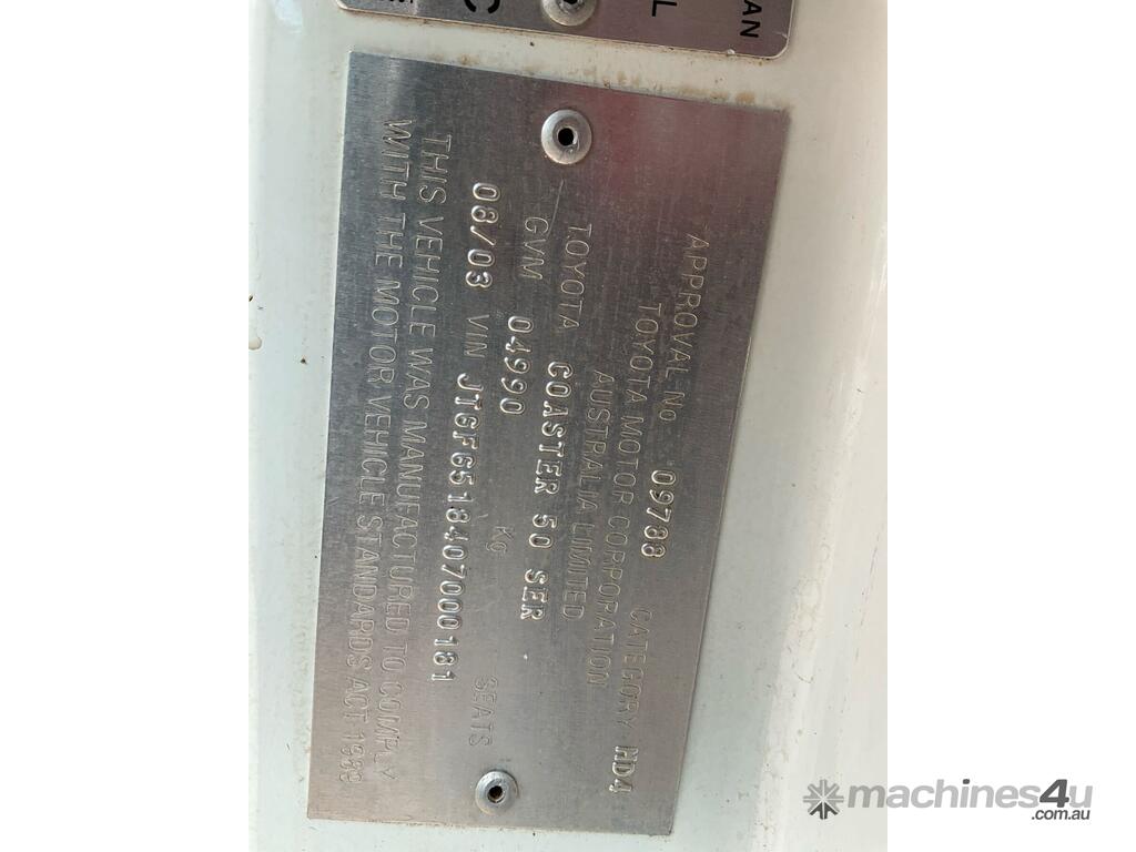 CP: 08/2003,Toyota,Coaster 50 Series,Bus,Manual,Leaf Spring Suspension ,4 Cyl,Diesel Turbo,6 Gears,78796 (Kms. Showing on Odometer),Hourmeter not visible,Colour: White,Unregistered WA,VIN: JTGFG81,Key No: 565,GVM: 4990,Sold with No Plates,Key No: 565