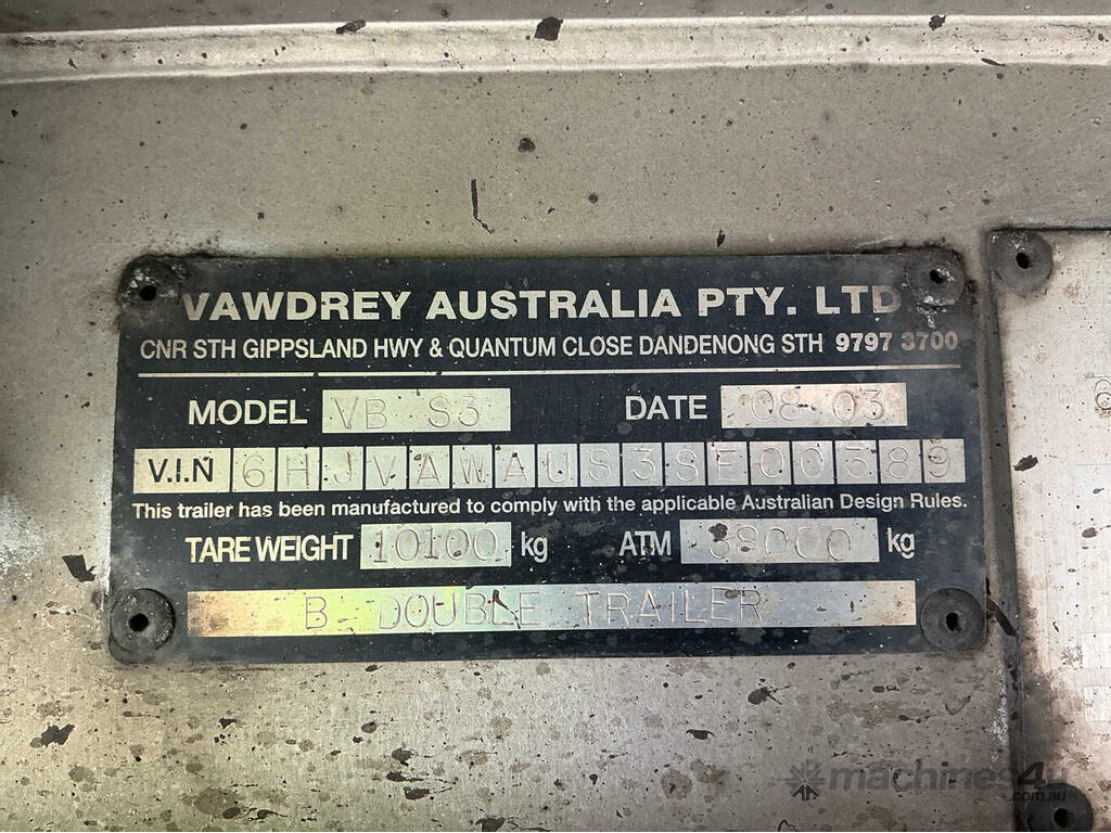 CP: 08/2003,Vawdrey,VB S3,Tri Axle Drop Deck Curtainsider B Trailer,Hubometer not visible,Colour: Blue,Rego. No: NP(YV06DK), Unregistered,VIN: 6HJVAWAUS3SE00389,Sold with No Plates