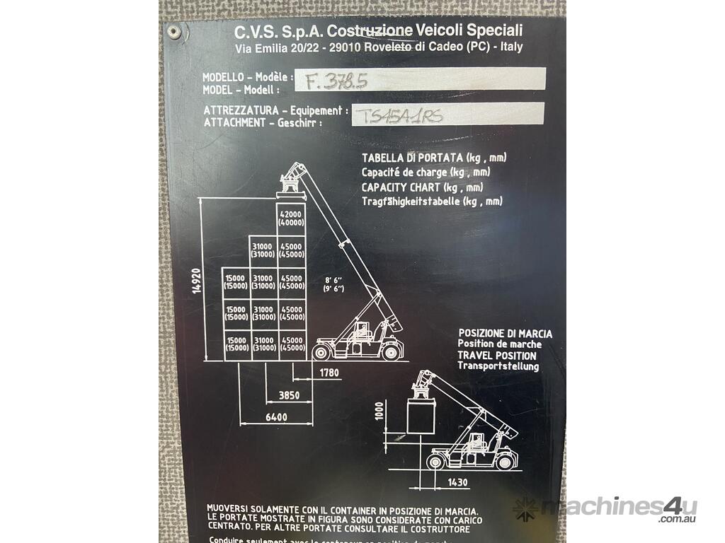 CP: CIRCA 2004,Ferrari,F378.5,Reach Stacker,Odometer not visible,9410 (Hrs. Showing on Hour meter),Colour: Red,Unregistered,VIN: ZA9F378H501A26011,Sold with No Plates