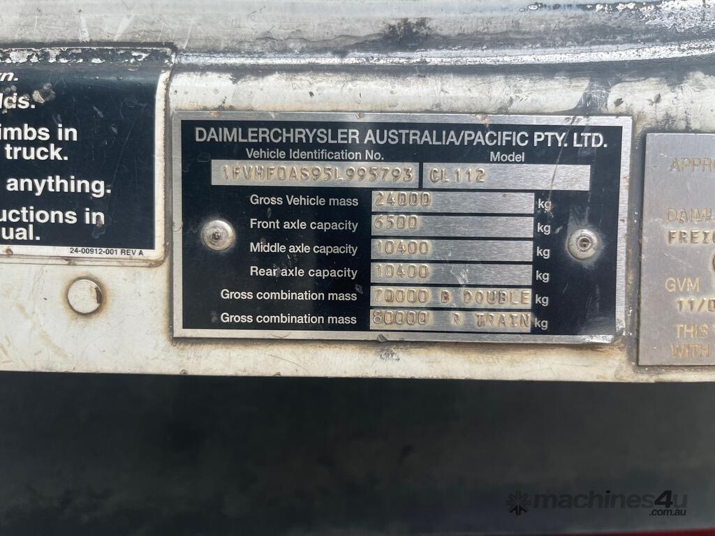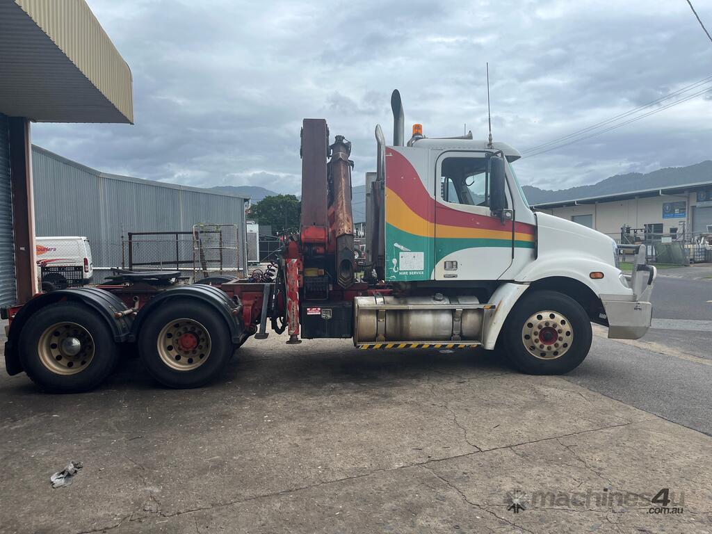 CP: 11/2004,Freightliner,Columbia CL112,Prime Mover Crane Truck,Manual,Airbag,Engine #: 2KS97435,Caterpillar C-12,12 Ltr,6 Cyl,Diesel,18 Gears,113480 (Kms. Showing on Odometer),Hourmeter not visible,Rego. No: NP(680IKG), Unregistered QLD,VIN: 1FVHF0AS95L995793,GVM: 24000,GCM: 80000,Sold with No Plates