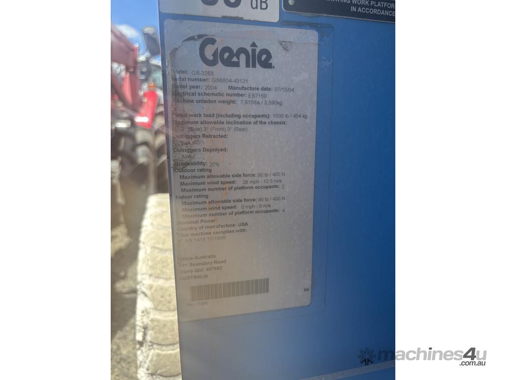 CP: CIRCA 2004,Genie,GS-3268,Scissor Lift,Electric,Odometer not visible,888 (Hrs. Showing on Hour meter),Colour: Orange,Unregistered,Serial No: 43131,Sold with No Plates,Key No: 359