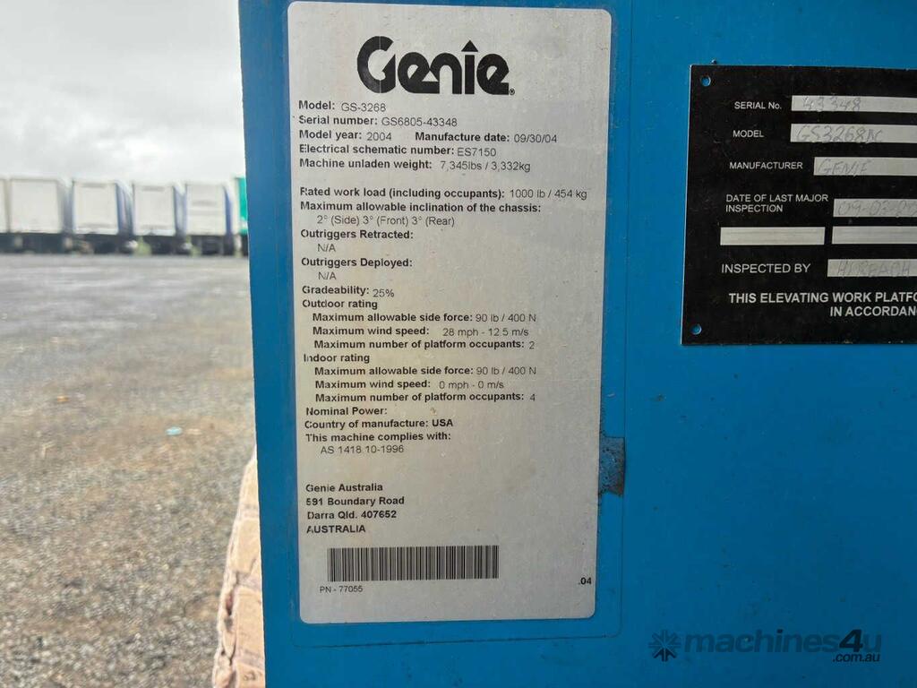 CP: 09/2004,Genie,GS3268,Scissor Lift,Odometer not visible,828 (Hrs. Showing on Hour meter),Colour: Orange,Unregistered,Serial No: GS6805-43348,Sold with No Plates,Key No: 396