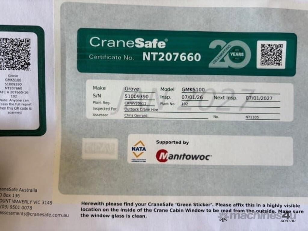 No C/P,Built: 01/2004,Grove,GMK5100,All Terrain Crane,15.9 Ltr,8 Cyl,Diesel Turbo,16 Gears,208537 (Kms. Showing on Odometer),0 (undefined),Colour: White,Unregistered,Serial No: 51009390,Sold with No Plates